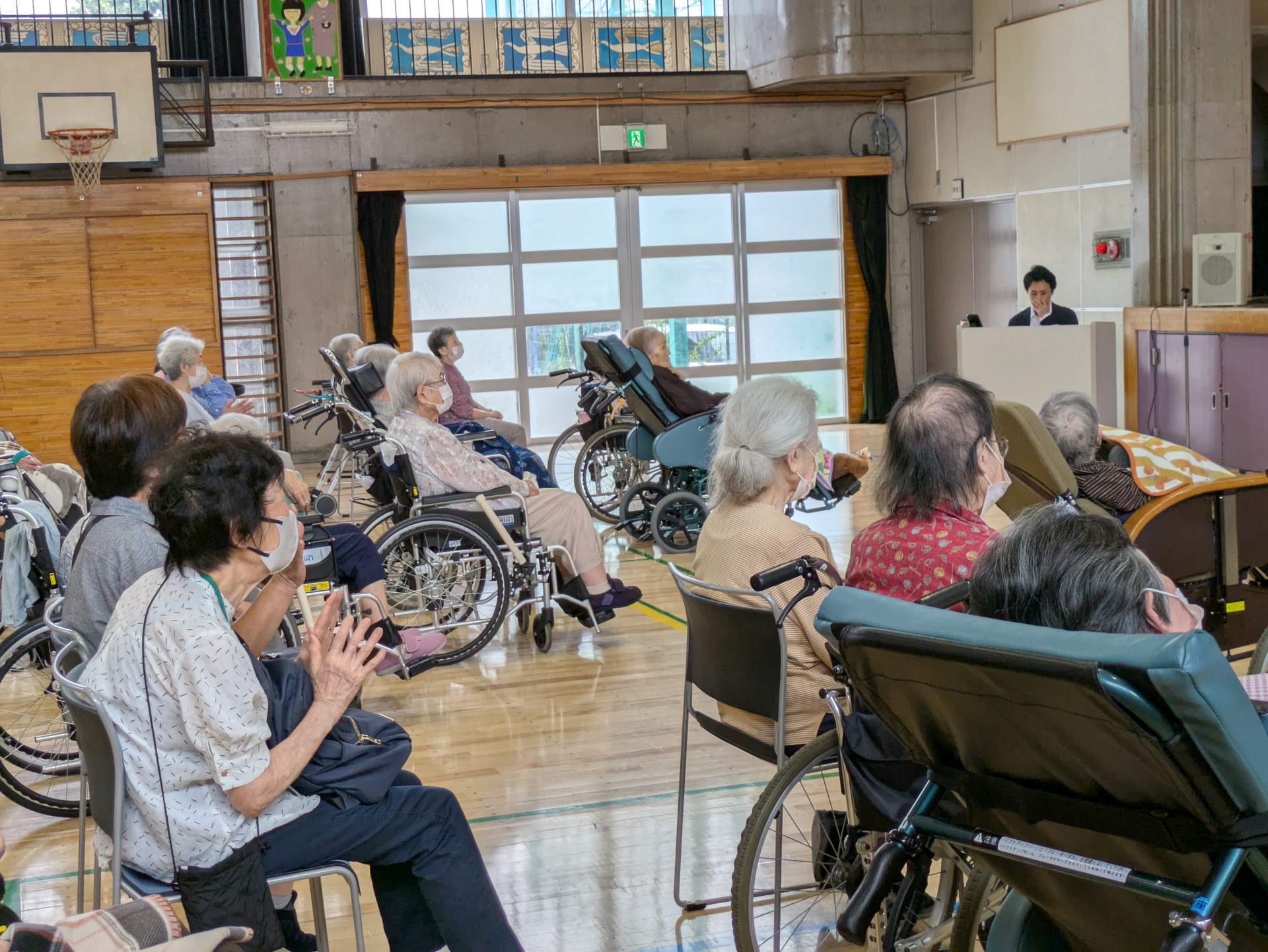 最初は、ラフターヨガといって、笑顔を作る体操をしてくださって、一生懸命マネをしながら、利用者様方が行っていました。