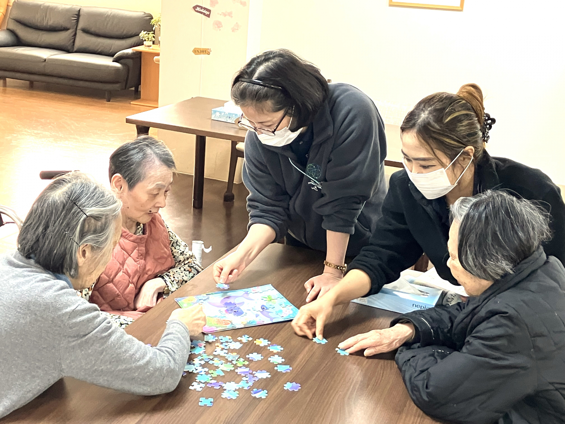 スタッフも加わりみんなでパズルの完成を目指していました