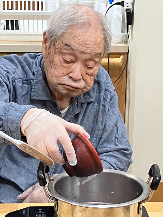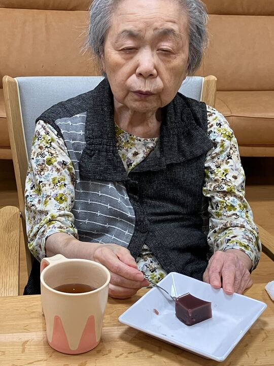 普段は、職員で食事を介助させていただいている方も、今日の羊羹は自身でスプーンを持ち