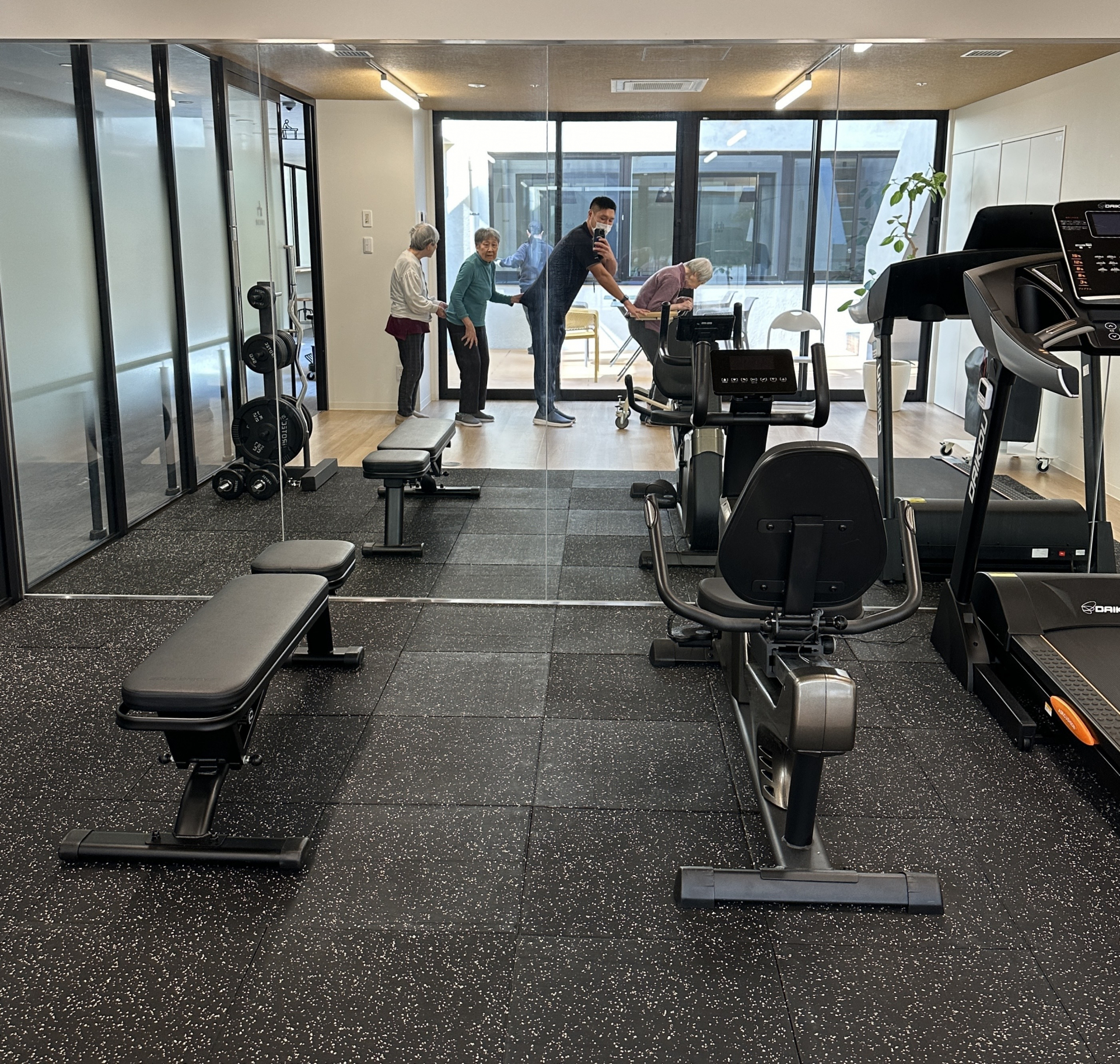 リカンベントバイク、トレッドミル、バーベルやダンベルが置いてあり、