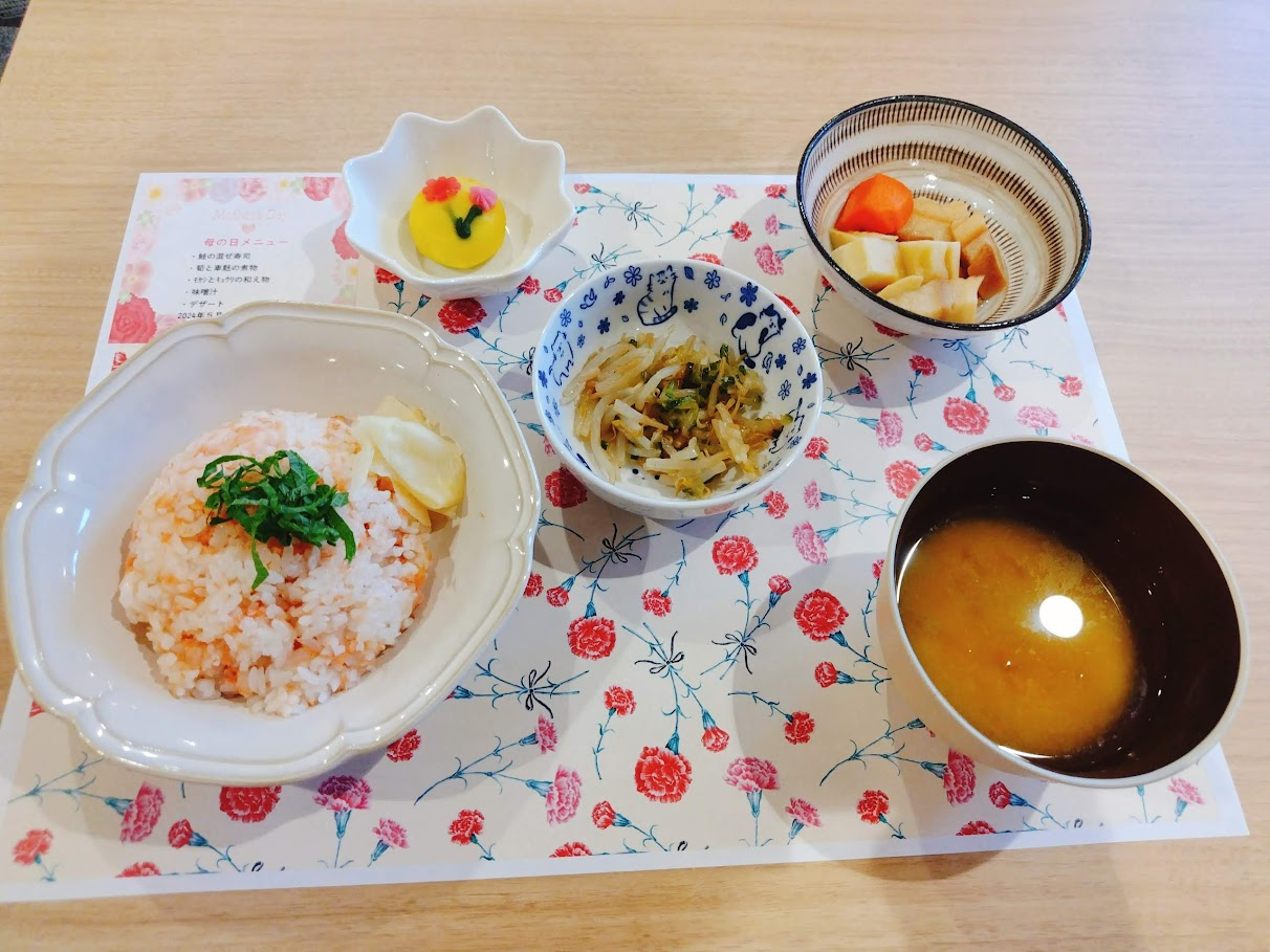 2024.05.10 お食事 母の日メニュー Tweet シェアする 母の日にカーネーションのランチョンマットでお食事を提供しました。 鮭の混ぜ寿司 筍と車麩の煮物 モヤシとキュウリの和え物 味噌汁 デザートはカーネーションの練り切りでした。 管理栄養士 前の記事 2024.05.17 お食事 昭和食堂の日 次の記事 2024.05.09 お食事 山菜そば 一覧へ戻る