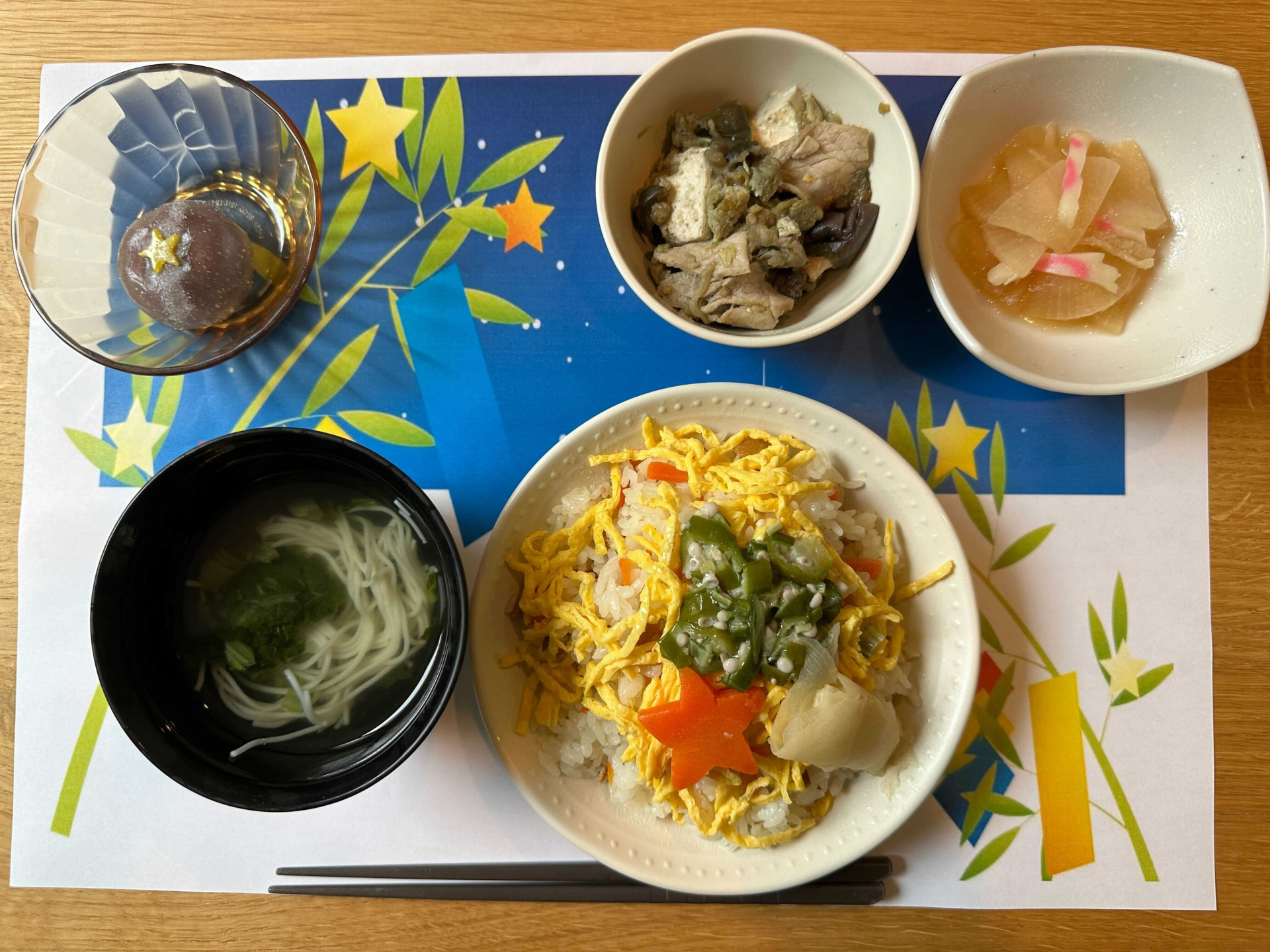 2024.07.16 お食事 七夕メニュー Tweet シェアする 先日七夕メニューを提供しました。 星型の人参のちらし寿司で七夕の雰囲気を味わっていただきました。 管理栄養士 前の記事 2024.07.16 お食事 夏祭りの準備 次の記事 2024.07.11 お食事 カフェまで歩行訓練 一覧へ戻る