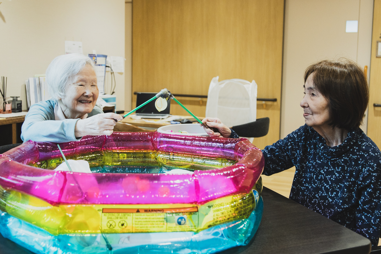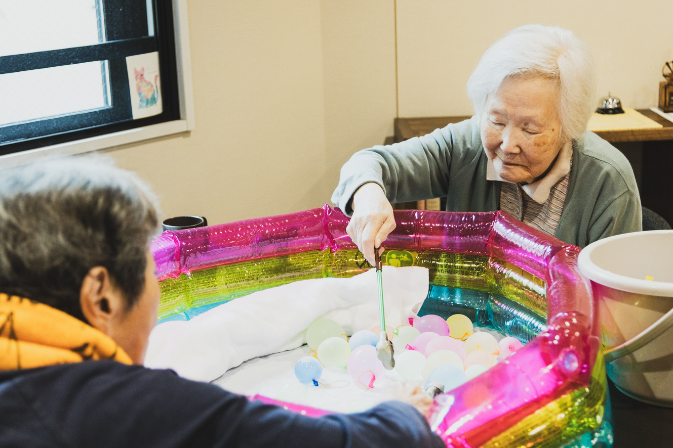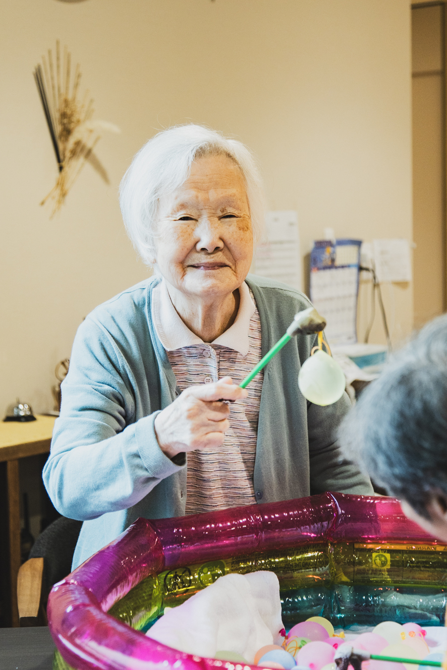 椅子から立ち上がって覗き込むように風船を狙ったり