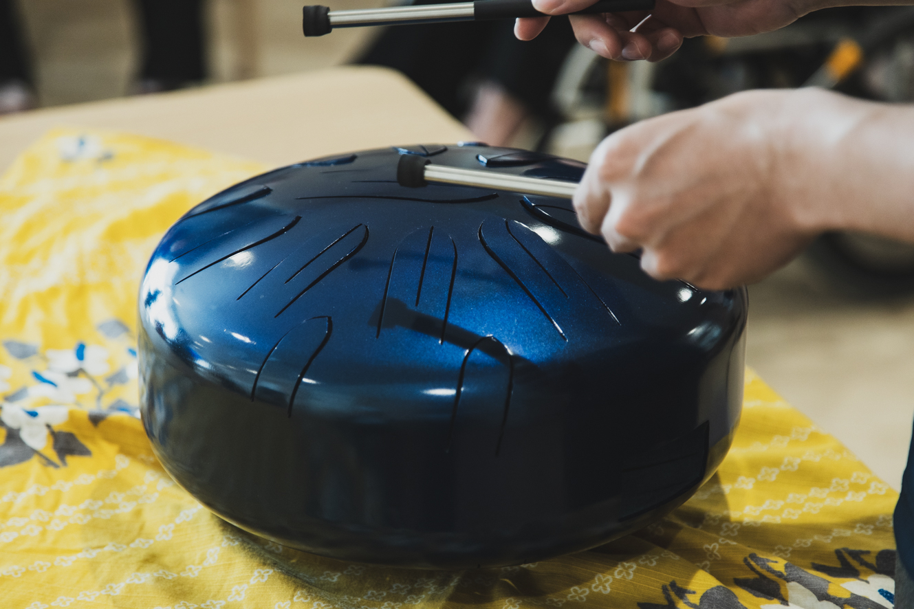 叩くとぽわ〜んと音が広がり、テーブルにも振動が。