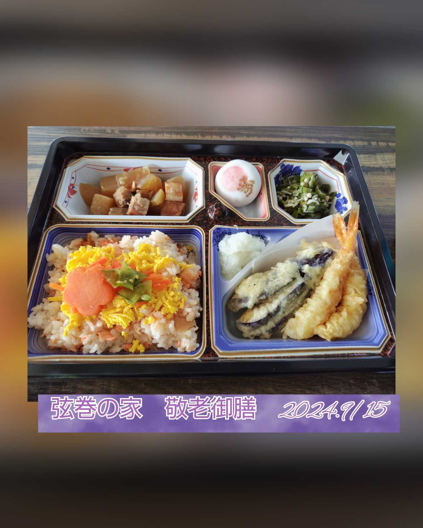 2024.09.30 お食事 敬老御膳 Tweet シェアする 先日、敬老会で提供した敬老御膳のご紹介です。 今年は海老天ぷらが2本入った敬老御膳を提供いたしました。 壽のマーク入りのお饅頭も皆さまに大変好評でした。 支援課 管理栄養士 Y 前の記事 2024.10.01 お食事 9月のイベント食 次の記事 2024.09.30 お食事 夏の思い出【2S】 一覧へ戻る
