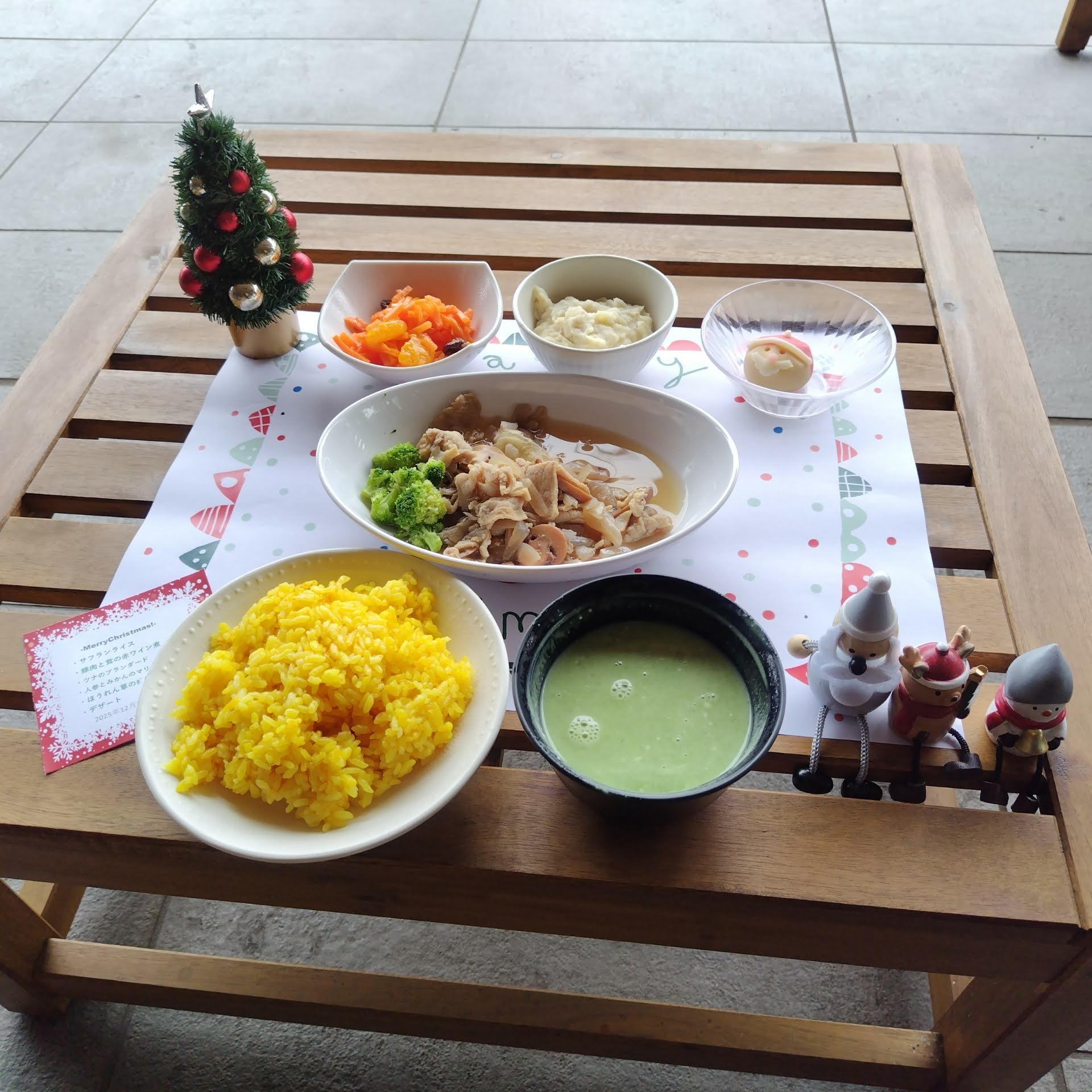 ほうれん草のポタージュは、やさしい緑色とまろやかな味わいで、体も心もほっと温まります。デザートは、見た目にも楽しいサンタの練り切り。