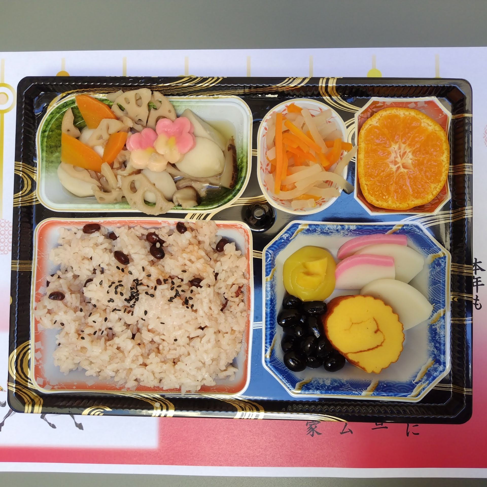「黒豆がツヤツヤして綺麗だね」「栗きんとんが甘くて一番好きだよ」と、お隣の方と特製のお弁当風のおせちを囲みながらお話が弾みます。 普段はお食事の進みがゆっくりな方も、今日ばかりは「おめでたいから全部いただこうかな」と、箸を進めていらっしゃったのが印象的でした。