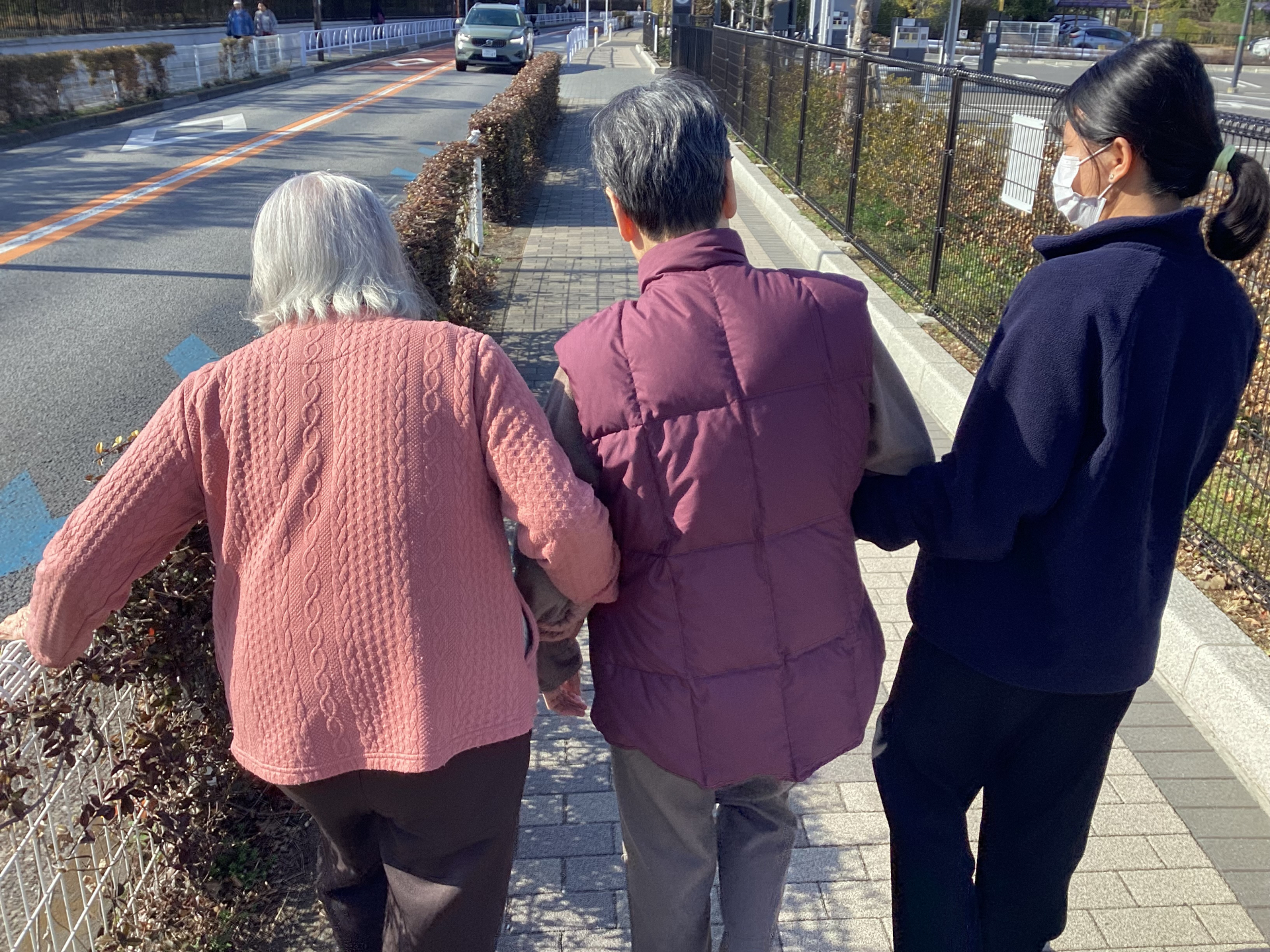 職員と一緒に久しぶりの外でのお散歩です。皆で手を取り合って気を付けながら向かいます。