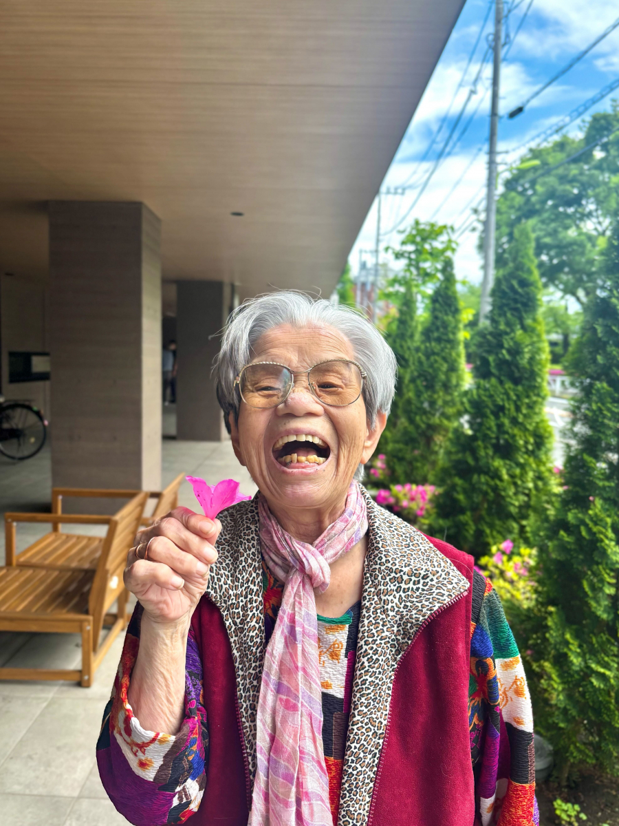 お庭につつじの花が落ちていたので一緒にパシャリ。いい笑顔いただきました。