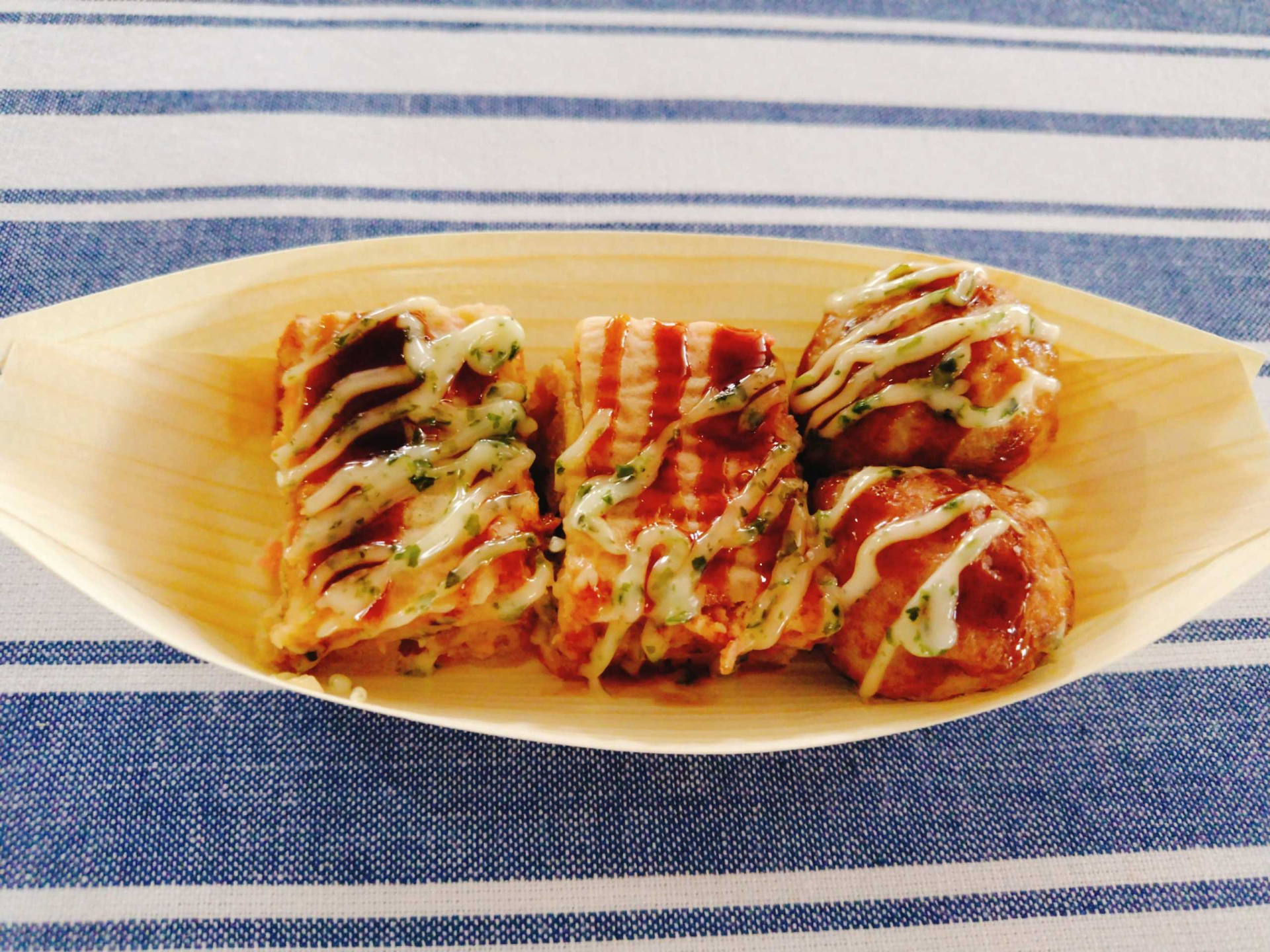 ・はとバスツアーの大阪編は、タコ焼きとお好み焼きを舟形の器で提供しました。