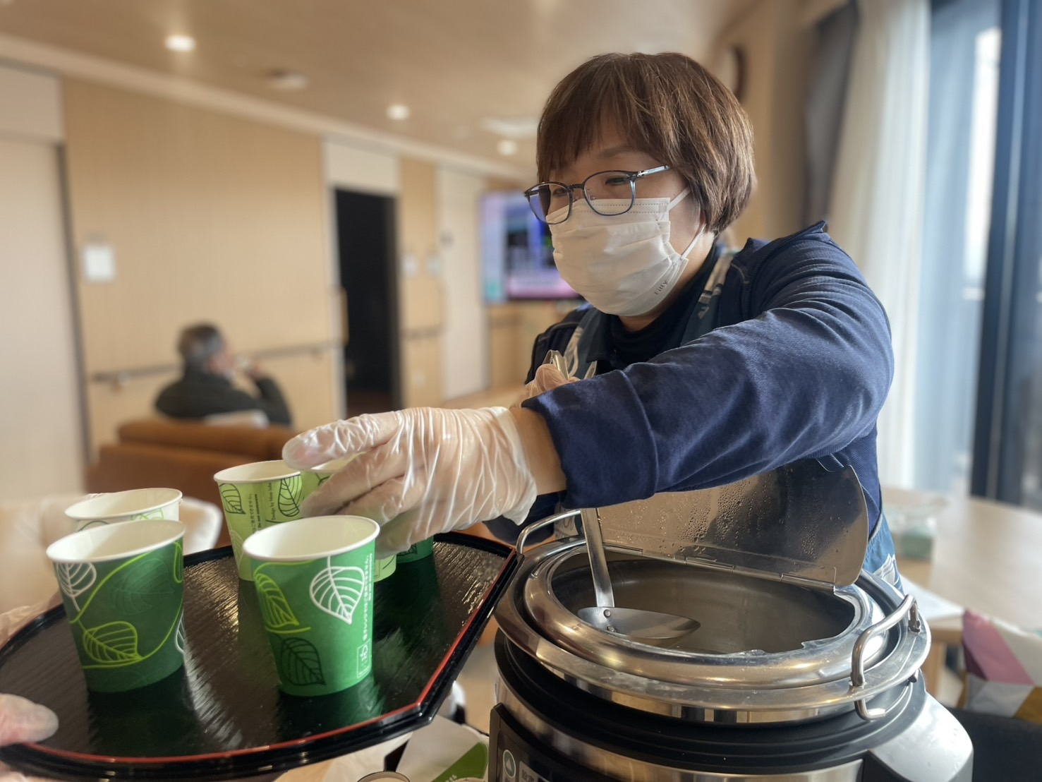 新年の訪れと共に、弦巻の家ショートステイでは甘酒を皆様にお配りしました。寒い日が続く中、温かい甘酒が体をぽかぽかと温め、ほっと一息つく時間をお楽しみいただきました。