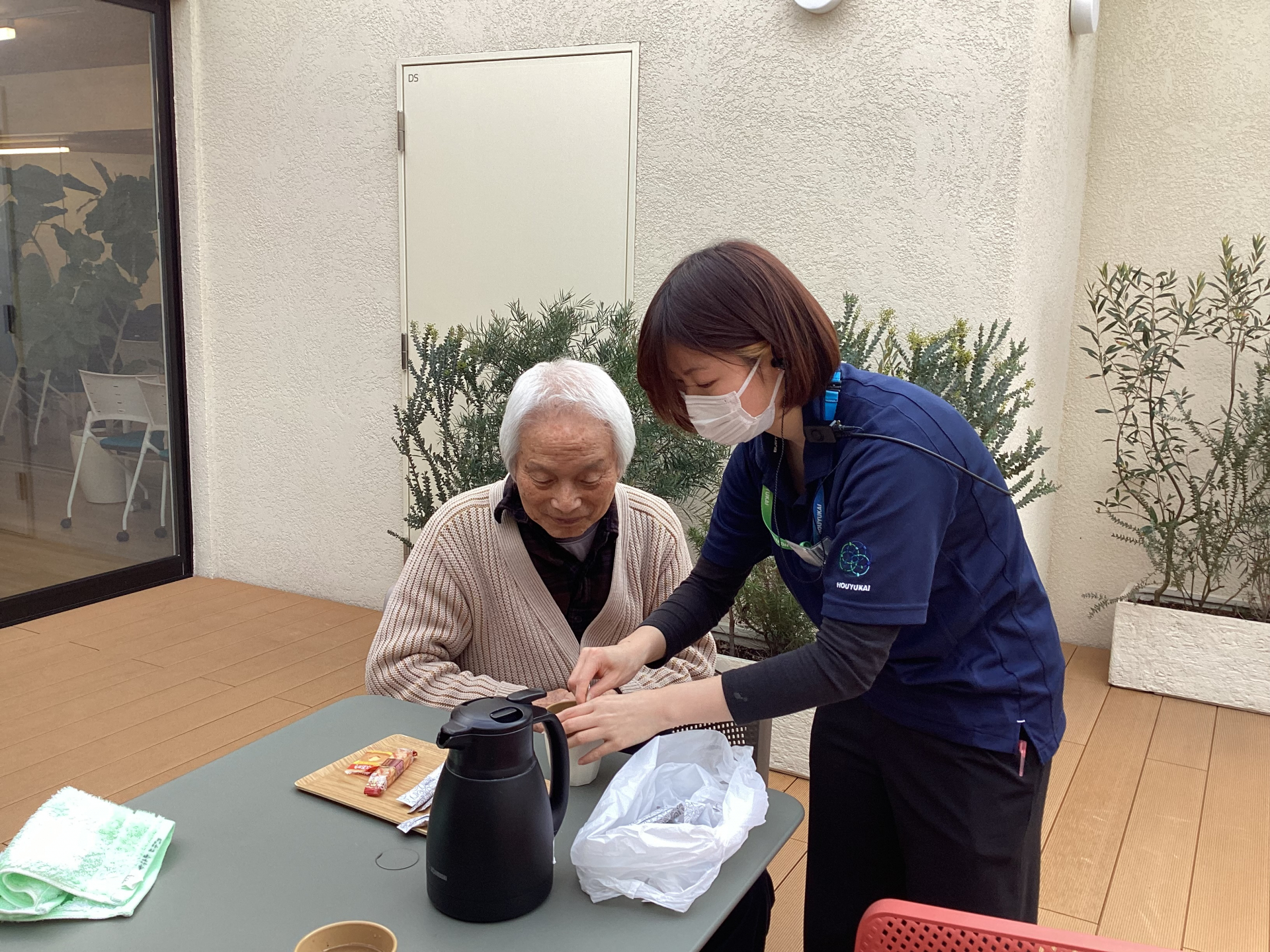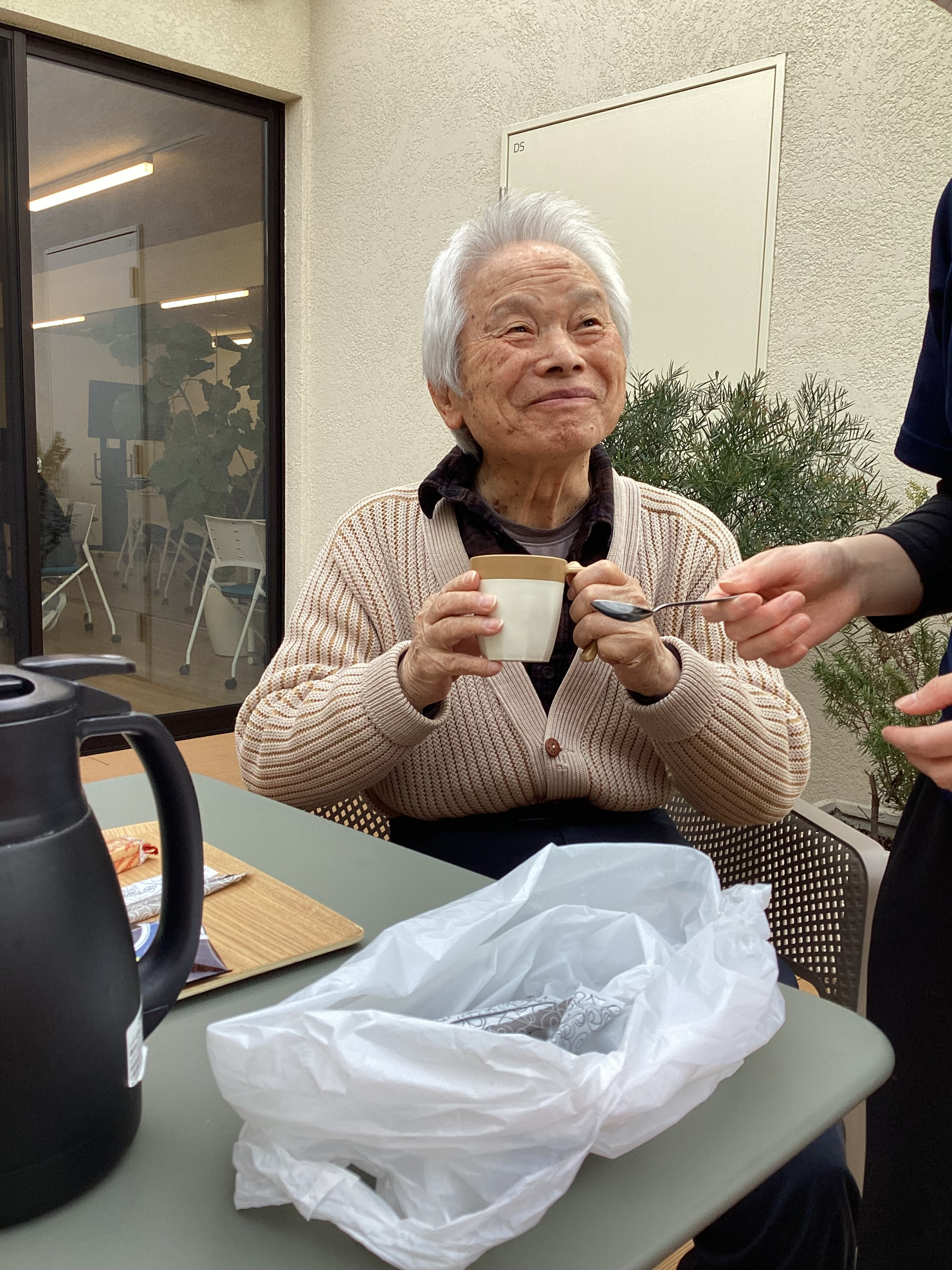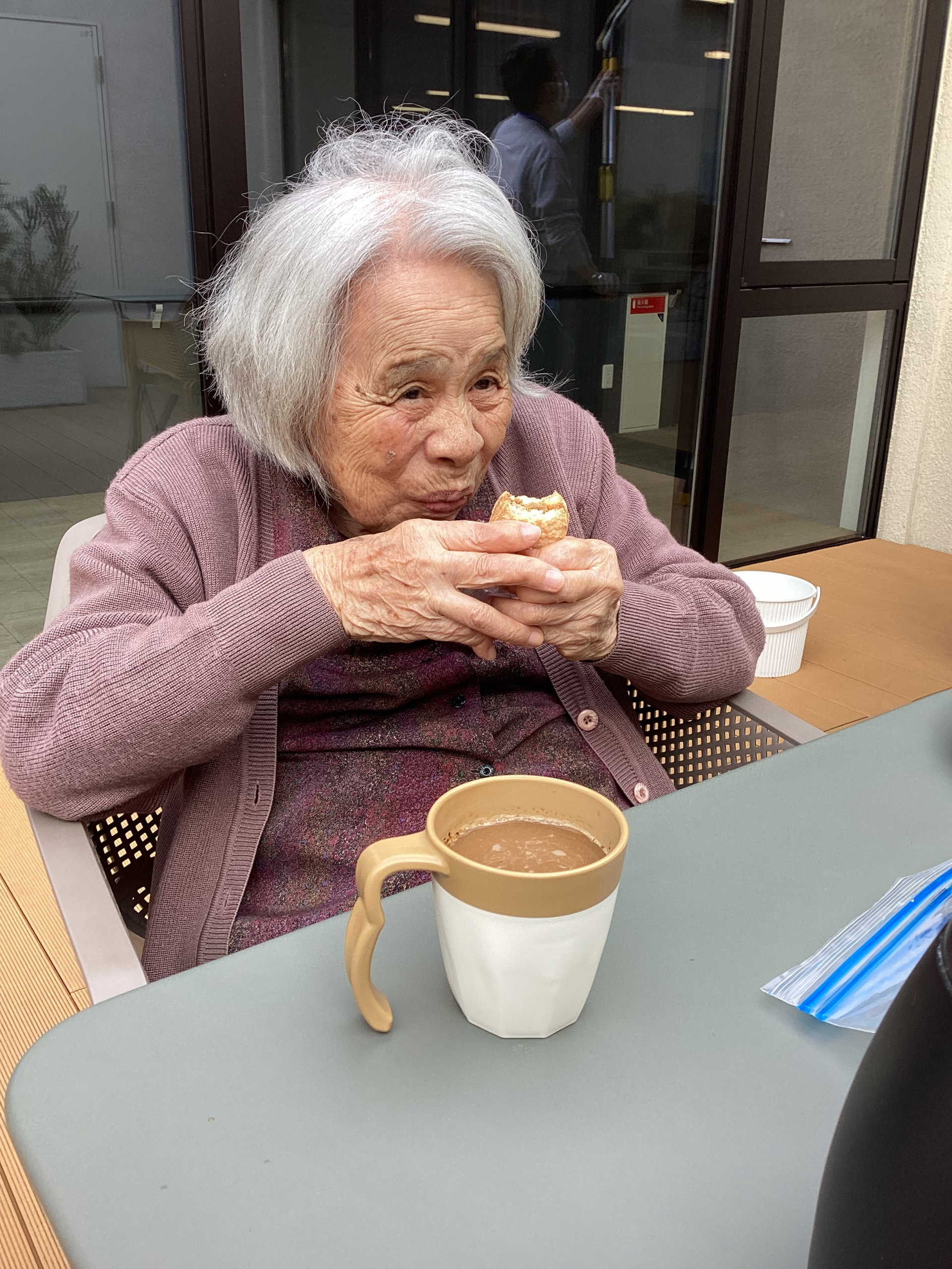温かいコーヒーとおやつを手に、外の空気を感じながらゆっくりとした時間をすごしました。