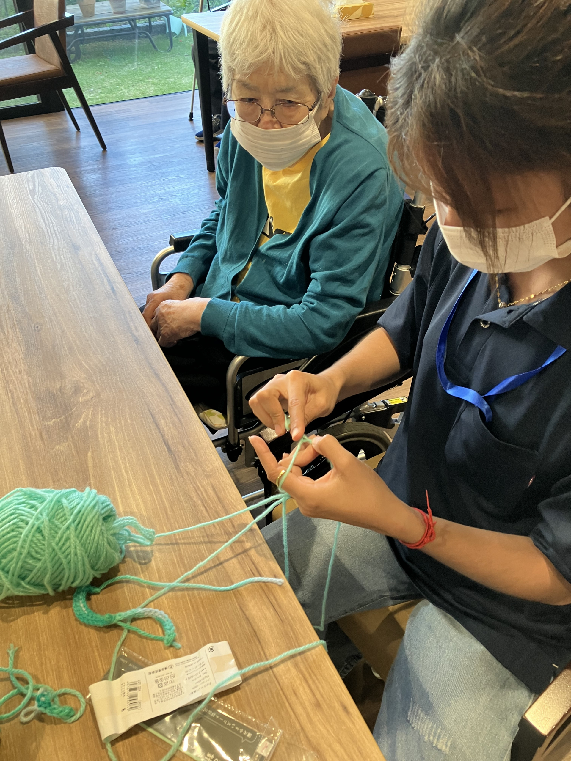 利用者様「私はもう手先がだめだからみるだけ」と、優しく目を細めながら黙々と編み進める職員を見守っています。