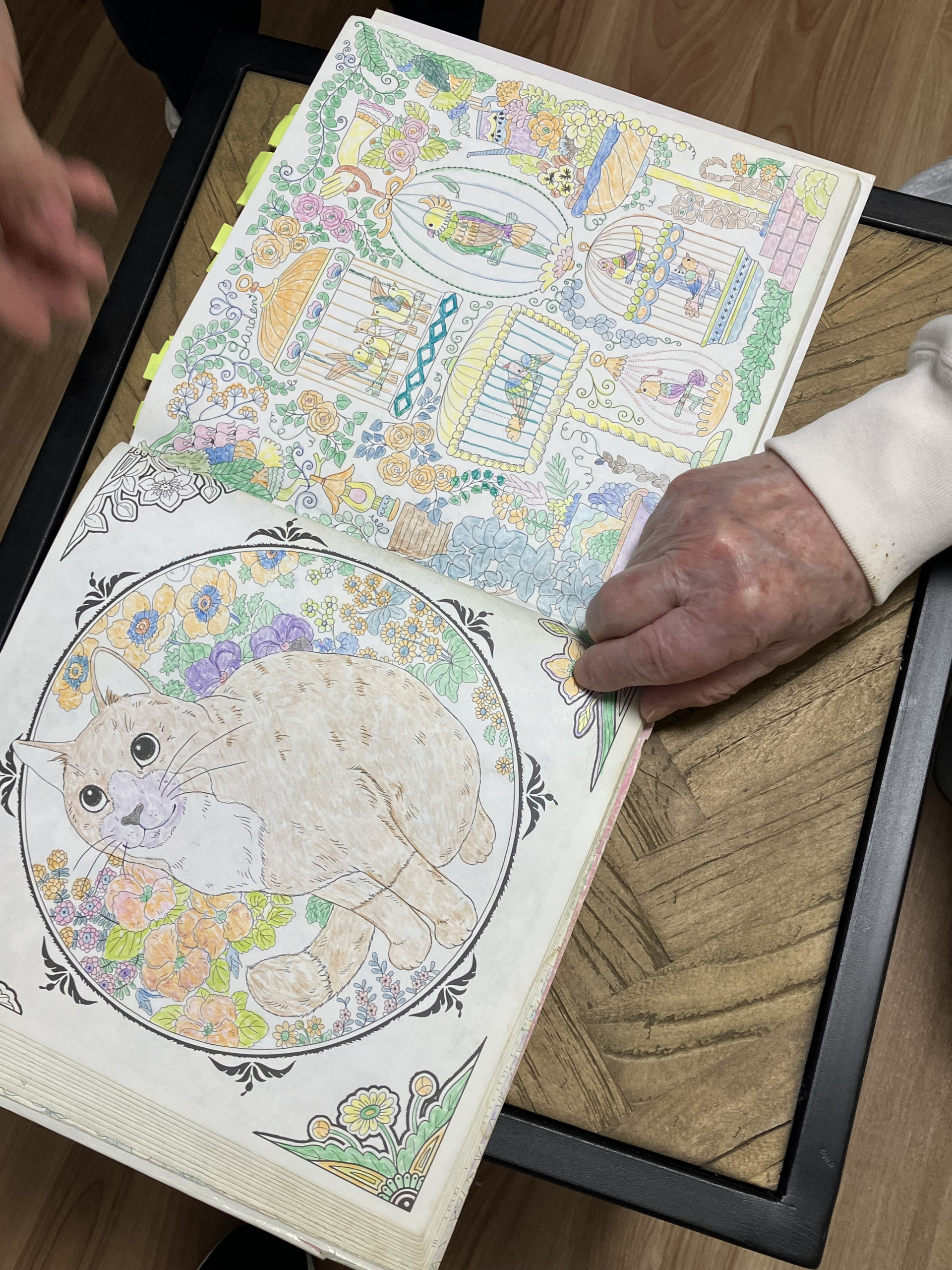 おやつの時間、A様がご自分で持参した塗り絵を居室で静かに取り組まれていました。ふと覗かせていただくと色使いがとてもやさしく、細かな部分まで丁寧に塗られた一枚が!!他の職員も呼び、一緒に今までの作品を見させていただきました。