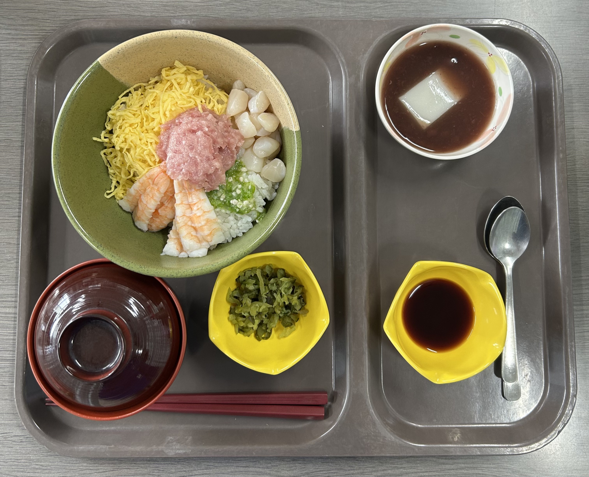 宝船のように色々な海鮮がのった島根のご当地丼やぜんざい発祥の地に因んだ「ちょこっとぜんざい」に、青しその香りが爽やかなお漬けもの、皆様美味しそうに召し上がり、完食される方がほとんどでした。島根県にご縁のある方も、行った事のない方も楽しめる献立だったと思います。来月もお楽しみに♪