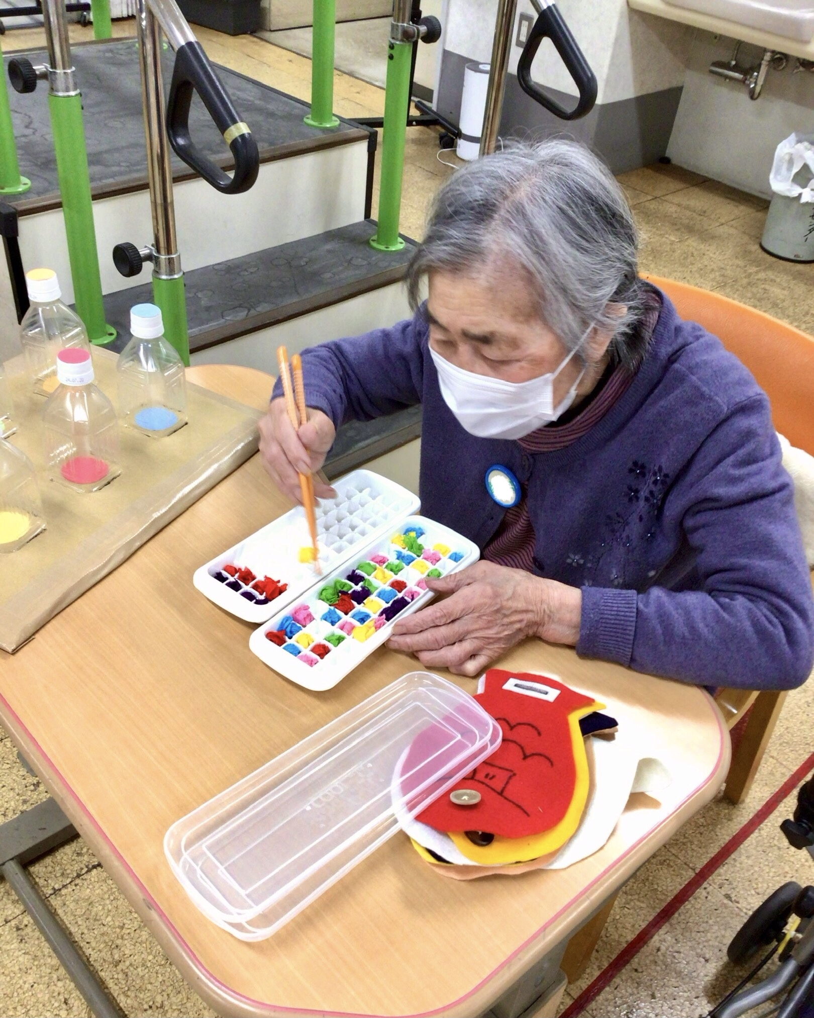 箸を使い、カラフルな髪のボールを移動させて同色で揃え、手指の訓練を行なっています。足や腕の運動とはまた違い、難しそうですが、楽しそうでもありますね!