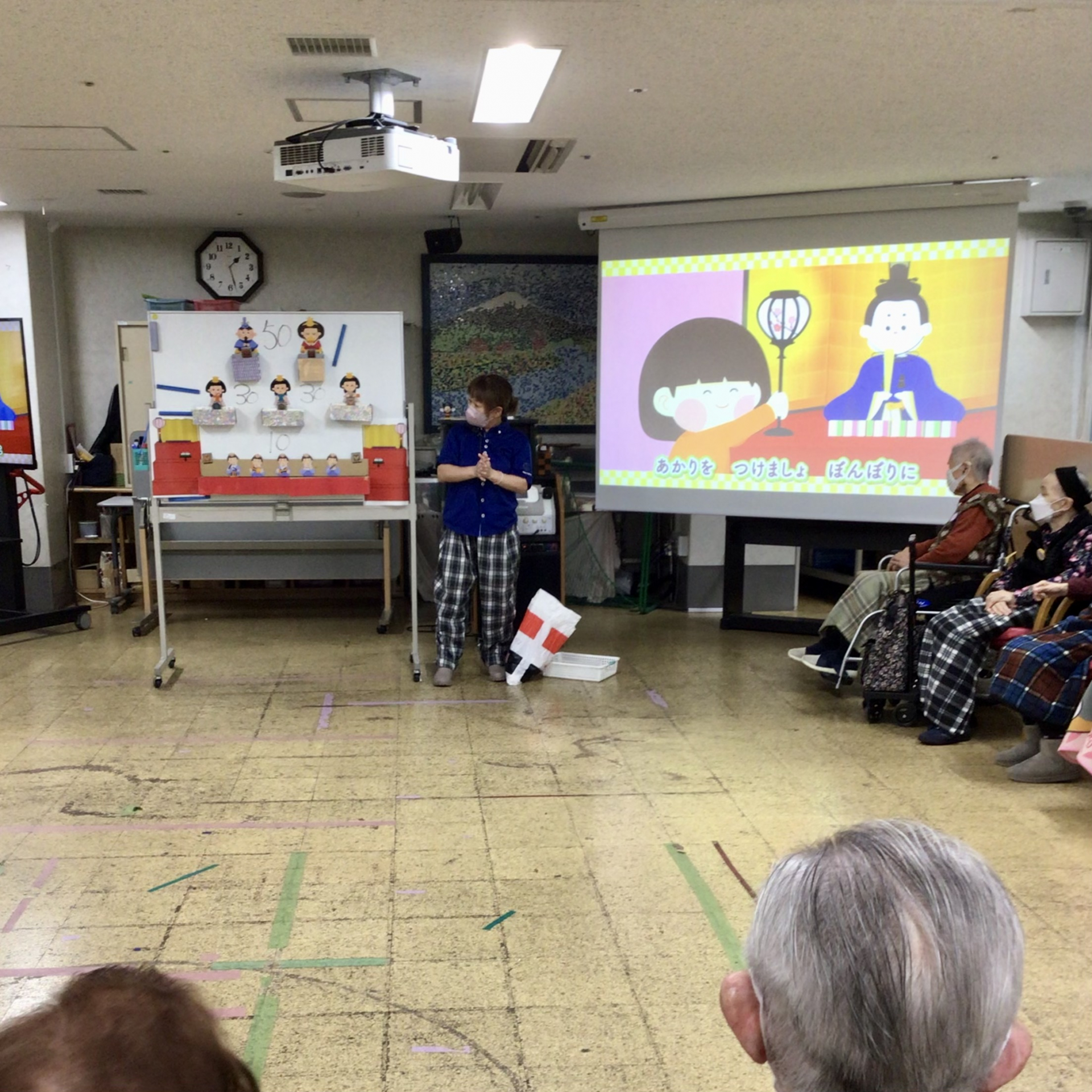 まずは皆様で「うれしいひなまつり」を歌いました。その後、ホワイトボードに貼ったお雛様の絵(箱)に玉を投げて入った点数を競いました。