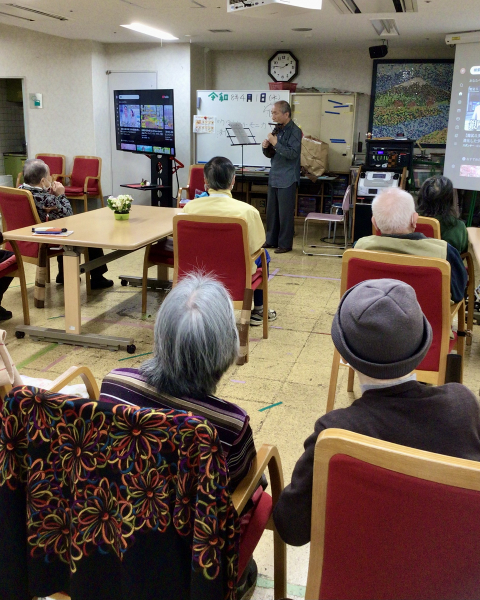 4月最初の午後のプログラムは「ウクレレハーモニカ」でした!渕上先生は最初に「花」(滝廉太郎)を演奏してくださるのですが、まさに今、春のうららの隅田川、の季節ですね(あいにくの雨が続いておりますが)