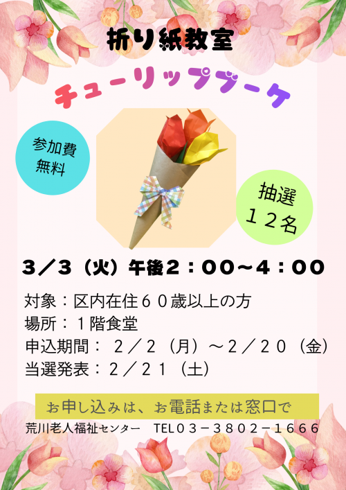 2026.02.13 ひらめきカードサロンが申し込み不要になりました! お知らせ 2026.02.13 今日の折り紙教室はおひなさまです! 活動報告 2026.02.12 折り紙教室「チューリップブーケ」参加者募集です♪ お知らせ 2026.02.12 いよいよ春の花の代表「さくら」がお花講座に!! 活動報告 2026.02.10 「初めてのタブレット講座」にお邪魔しました 活動報告 2026.02.09 「ころばん・せらばん体操」開催しました♪ 活動報告 2026.02.07 本日の「はじめてのソシアルダンス」 活動報告 2026.02.06 今日は、ばんざい体操からお届けします‼ 活動報告 2026.02.05 男性のためのグループトレーニングが行われました。 活動報告 2026.02.04 スローエアロ講座、開催いたしました 活動報告 2026.02.03 初めての絵手紙教室 ~第5回目~ 活動報告 2026.02.02 第2回目のひらめきカードサロンが開催されました! 活動報告 2026.01.30 認知症サポーター養成講座を受講いたしました 活動報告 2026.01.29 あらかわeスポーツパークが開催されました! 活動報告 2026.01.29 レクダンス講座が開催されました! 活動報告 1 2 3 4 5 6 … 58