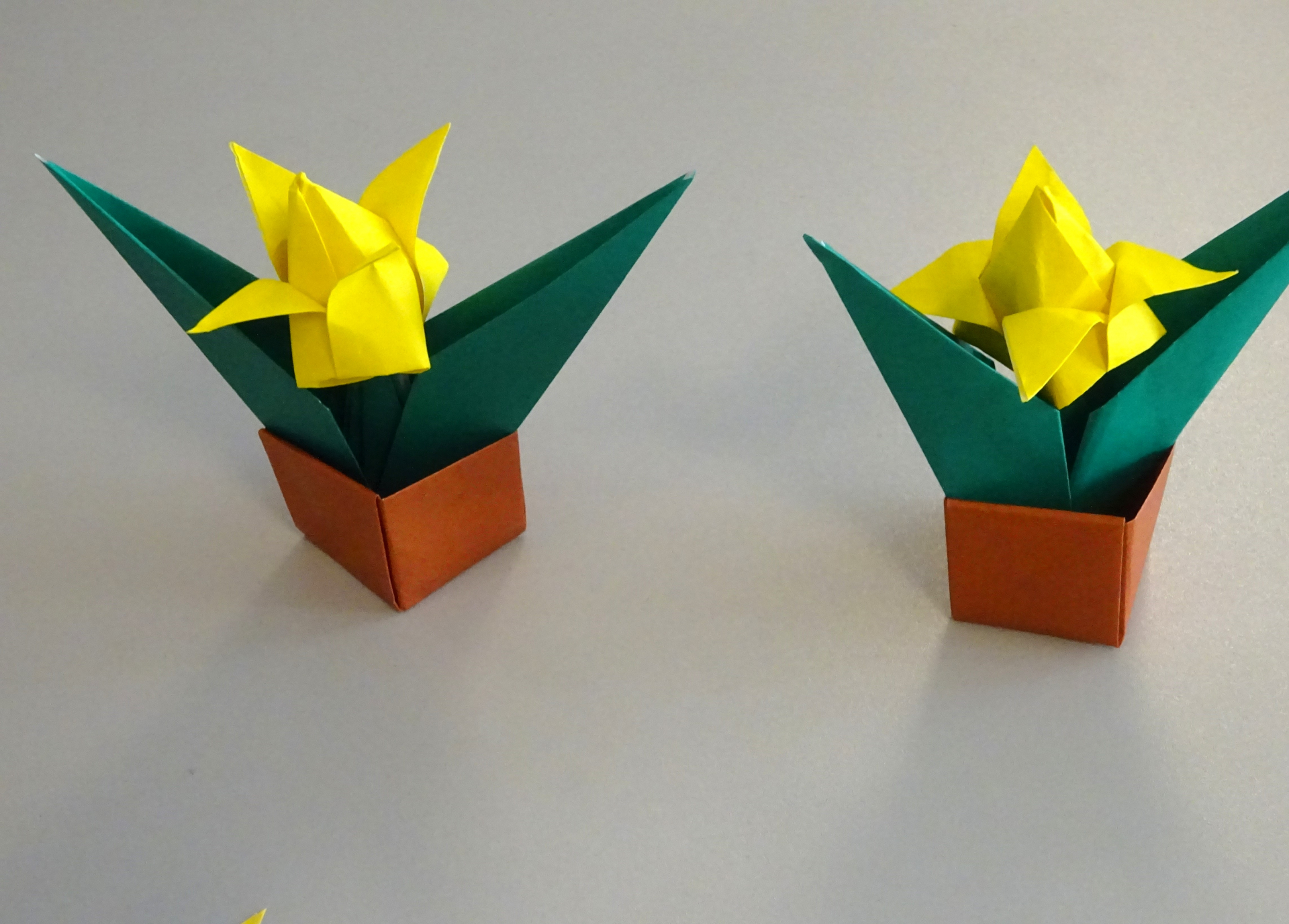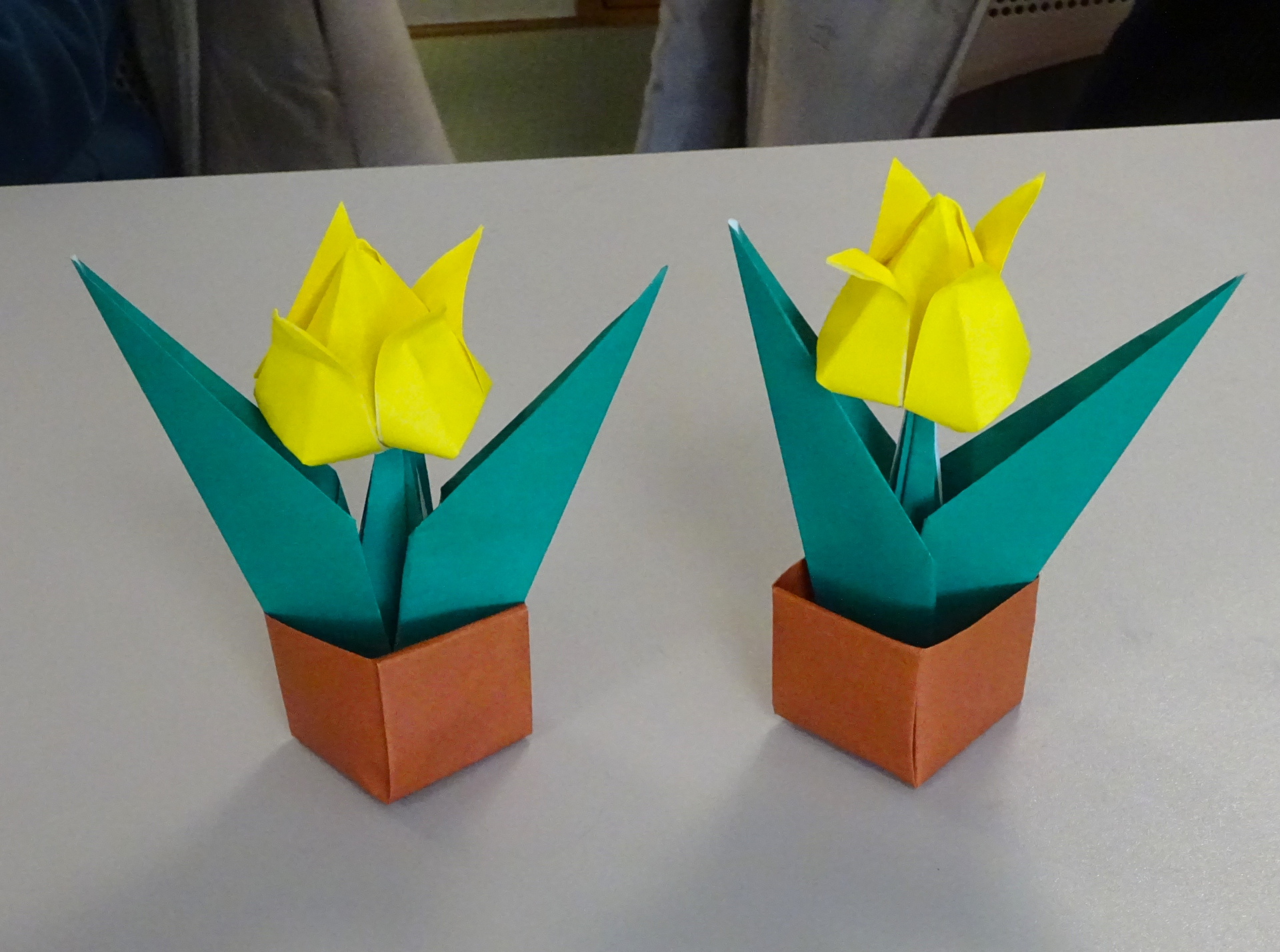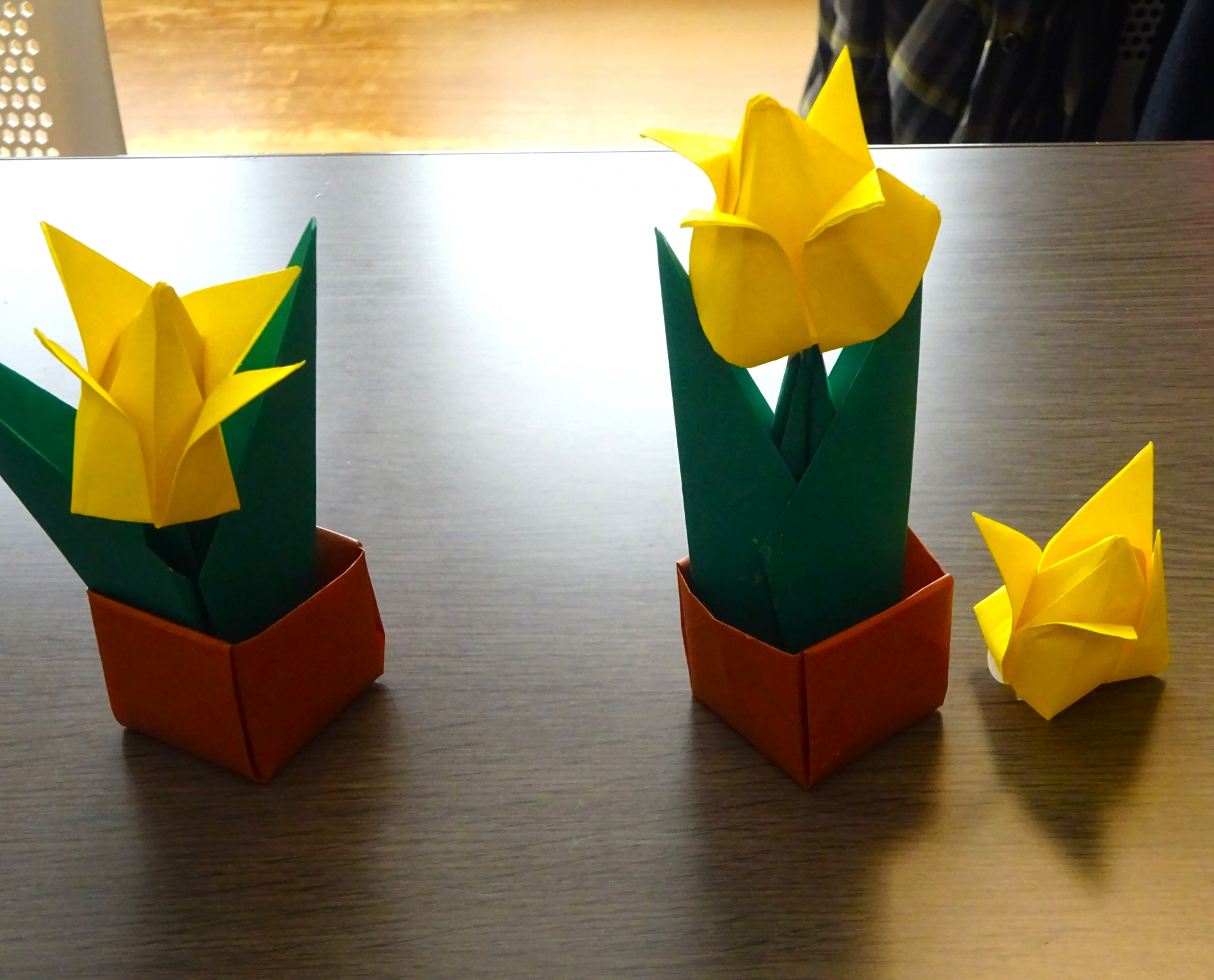 「鉢植えのチューリップ」なので、花と茎・葉と鉢の3種類の折り方で作りましたよ。