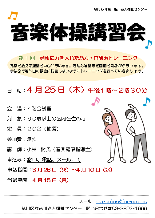 音楽健康指導士の方をお招きして、懐かしの昭和歌謡曲に合わせてエクササイズダンス♪をしたり、脳トレや筋力トレーニングを行うフレイル(加齢に伴って心身の衰えた状態)予防の楽しい講習会です。