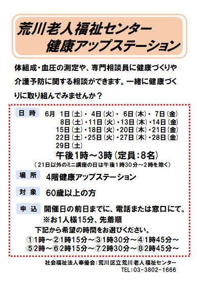 2024.05.25 お知らせ 6月の健康アップステーション Tweet シェアする 6月の健康相談とミニ講座は本日5月25日より受付です。 ミニ講座は5月31日までは電話受付のみとなります。 お申込みお待ちしております。 荒川老人福祉センター:ながや 前の記事 2024.05.25 お知らせ 4回目の硬筆講座は… 次の記事 2024.05.24 お知らせ 「笑顔で棒体操」開催しました!! 一覧へ戻る