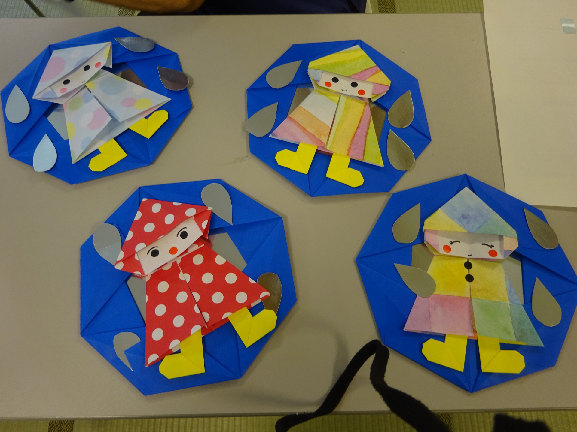 本日の折り紙教室は、ゆううつな梅雨を少しでも楽しく過ごして頂けるように、合羽を着て黄色い長靴を