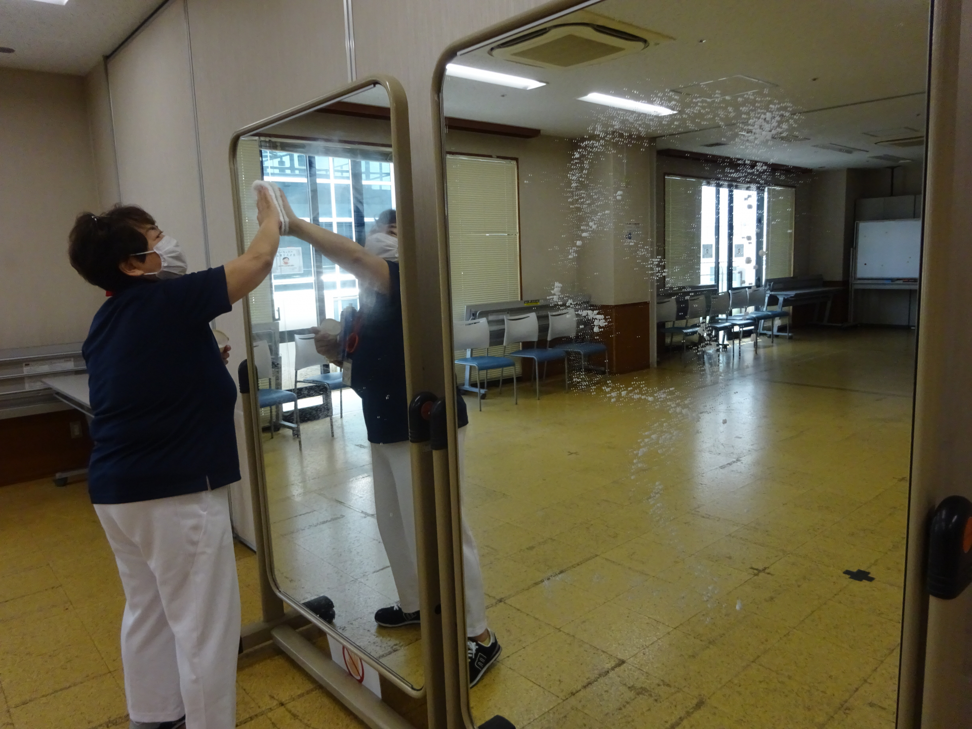 「みなさまの姿が綺麗に映りますように!」鏡を磨き、床もお掃除します。