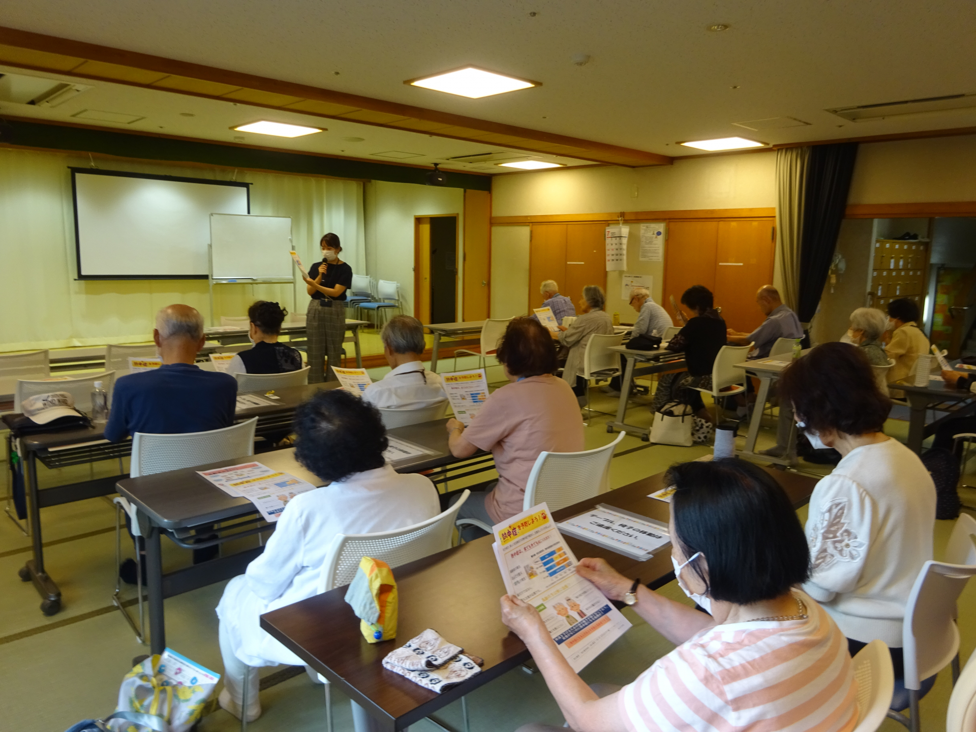 センターでは荒川地域包括センターの方を講師にお迎えして熱中症予防についてのお話です。湿度が高く暑さにまだ慣れていないこの時期は、熱中症になりやすくなるそうです。