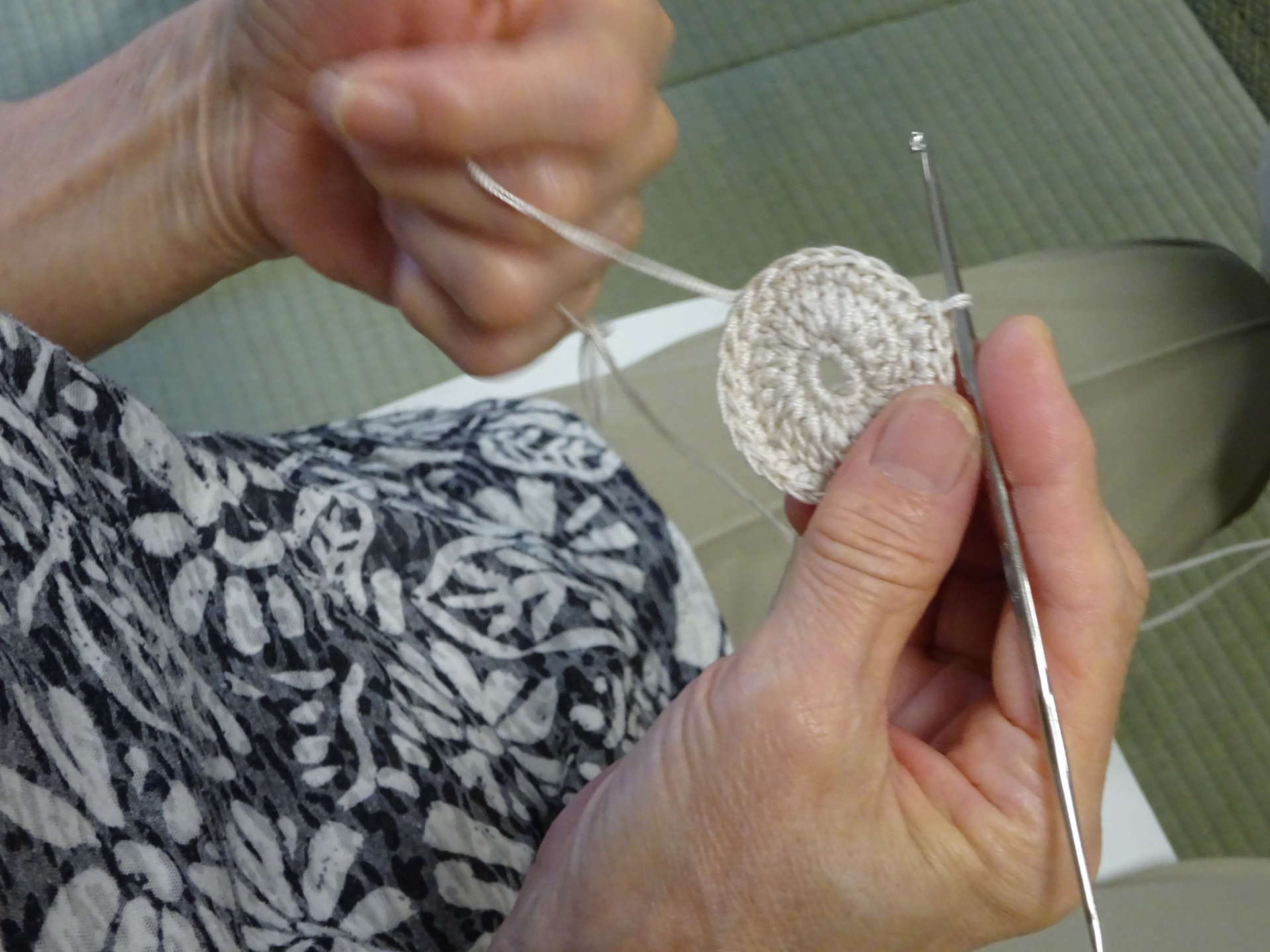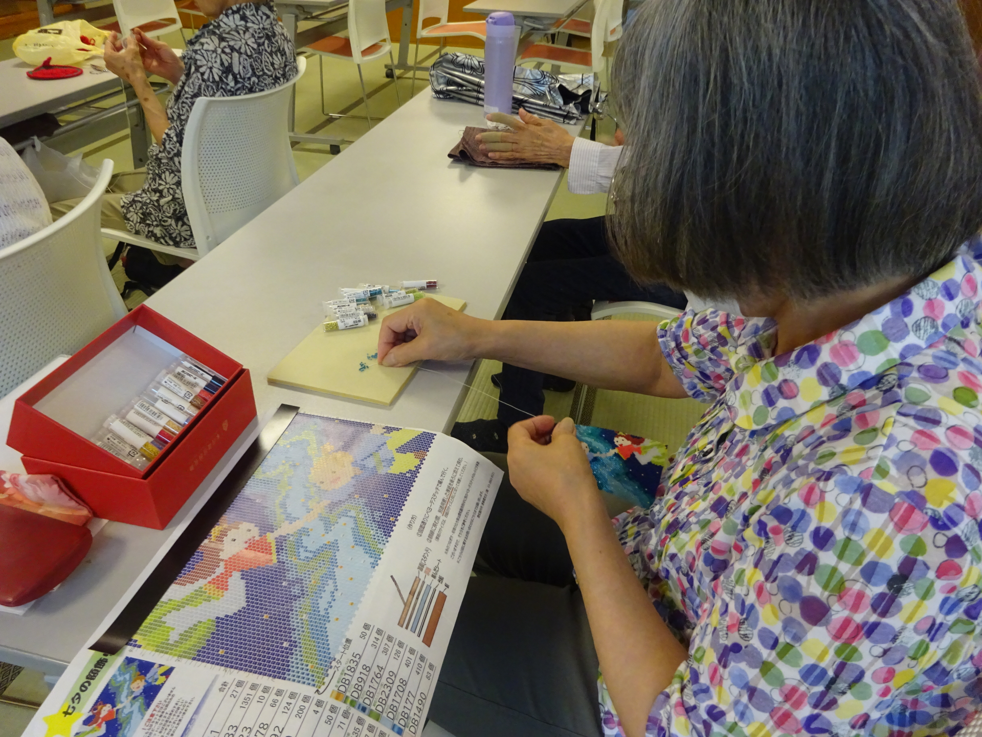 今日は、手芸事業にお邪魔しました。皆さん各自材料をお持ちになり、おしゃべりをしながら作品作りを楽しんでいました。