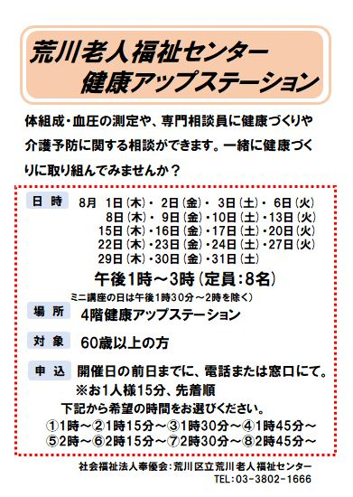 8月の健康アップステーション 「健康相談」と「ミニ講座」の予定です。