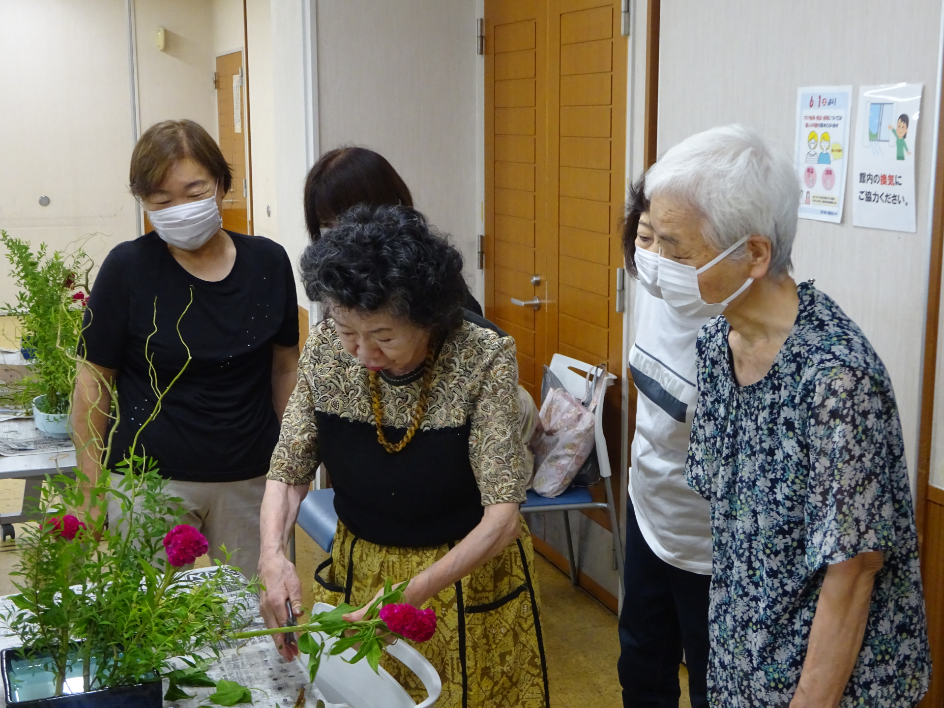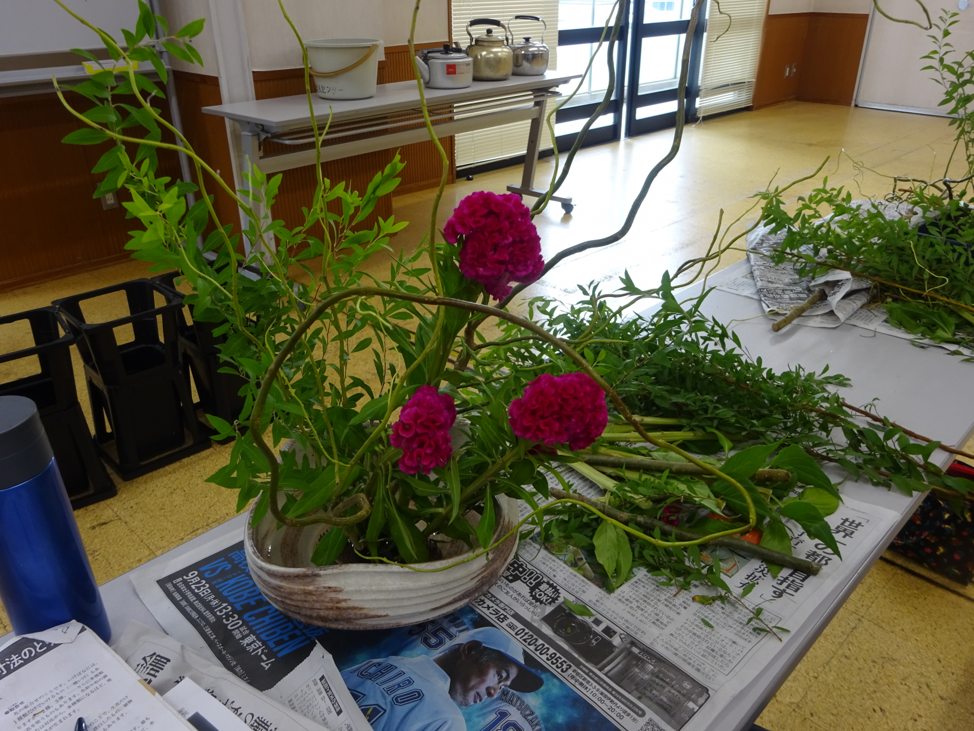 今日の午前中の教室はお・は・な教室です。花材は夏らしいケイトウ・雪柳・やなぎです。鮮やかな豪華な色合いです。