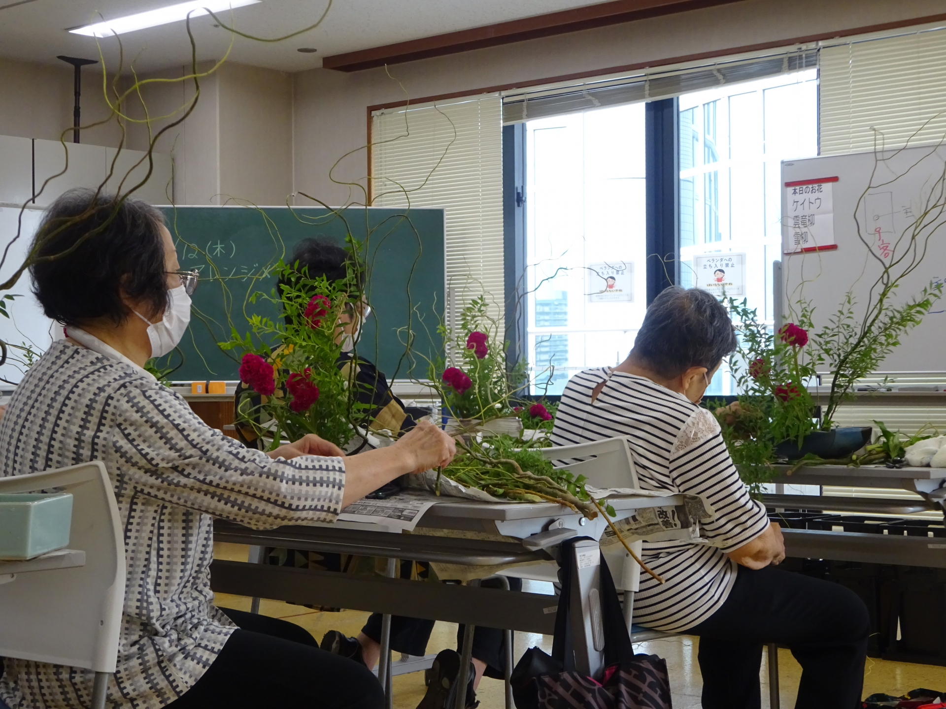 講師の説明を受け、ポイントとなる活け方を習い、皆さんのテーブルを講師が廻りより花材の活かし方を伝えて行きます。