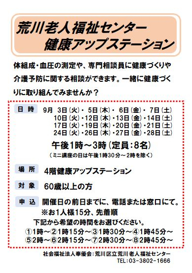 2024.08.24 お知らせ プロが教える 終活講座参加者募集 Tweet シェアする 9月14日(土)にプロが教える終活講座がおこなわれます。 ご興味がある方、この機会にぜひお申込みください。 お待ちしております。 荒川老人福祉センター 齋藤 前の記事 2024.08.24 お知らせ センターだより9月号発行しました 次の記事 2024.08.24 お知らせ 9月の健康アップステーション 一覧へ戻る