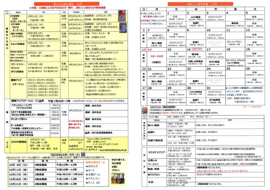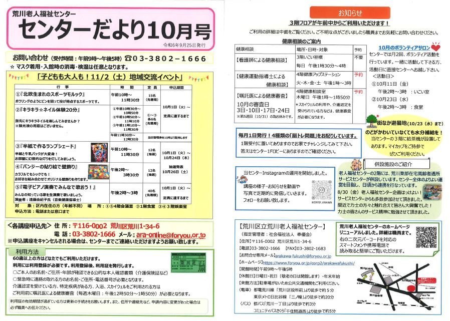 2024.09.25 お知らせ センターだより10月号発刊しました。 Tweet シェアする センターだより10月号発刊致しました。 前の記事 2024.09.27 お知らせ 折紙教室「秋の味覚のバスケット」 次の記事 2024.09.25 お知らせ 作品展はじまりました!! 一覧へ戻る