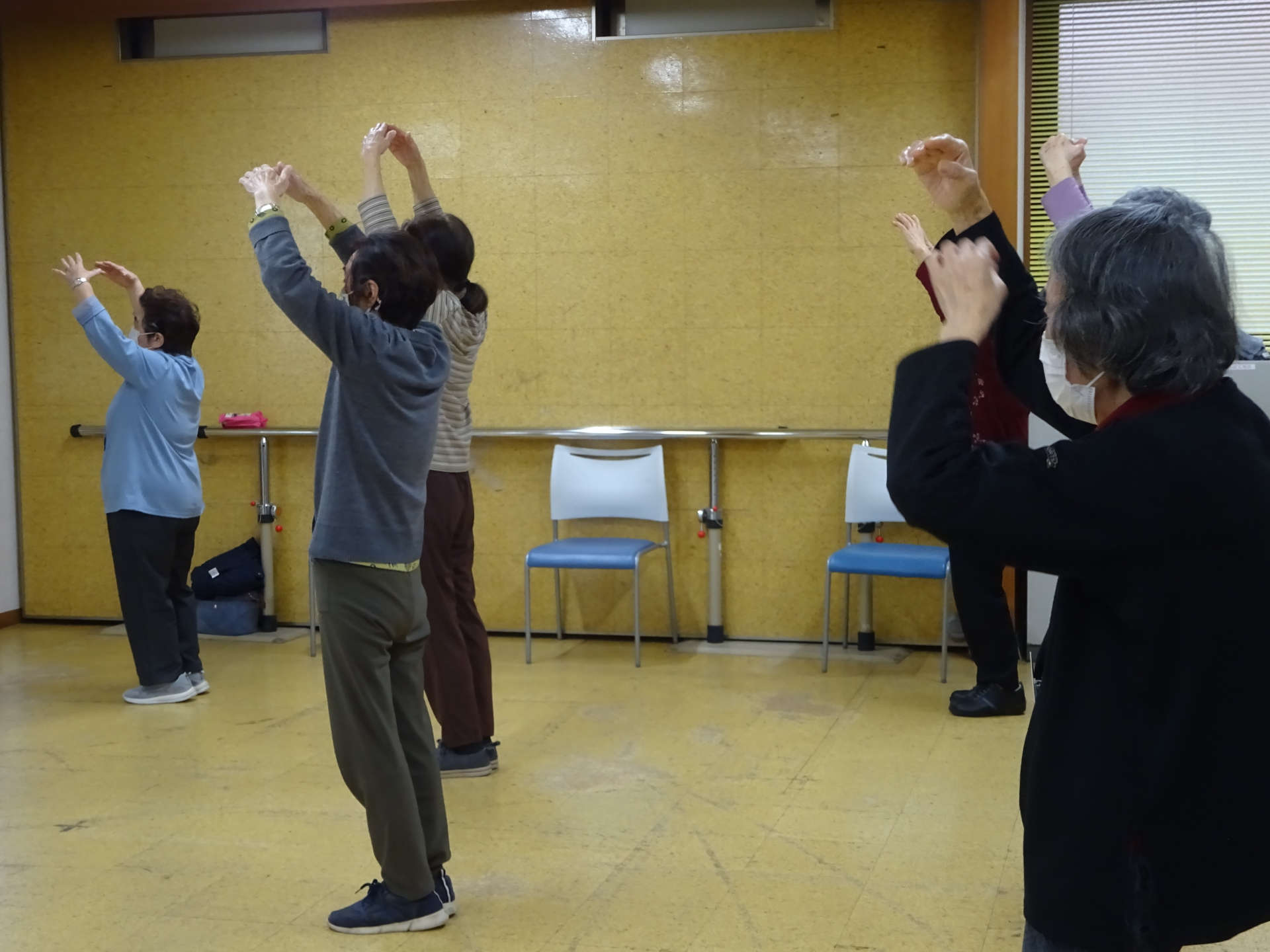 本日の健康体操は、昨日の暖かさと打って変わり寒空の中、お集まりいただきました。