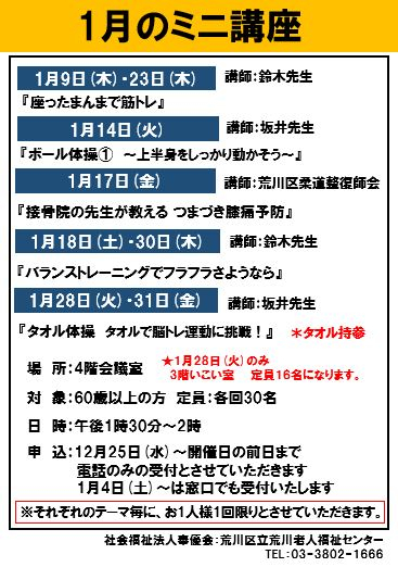 1月の健康アップステーション、「健康相談」と「ミニ講座」の日程です。