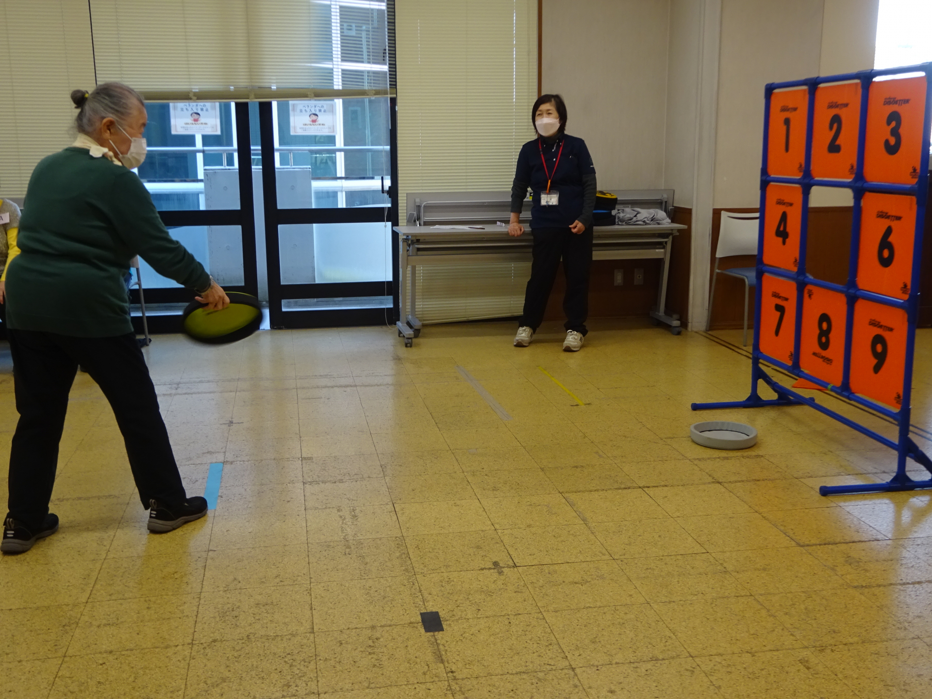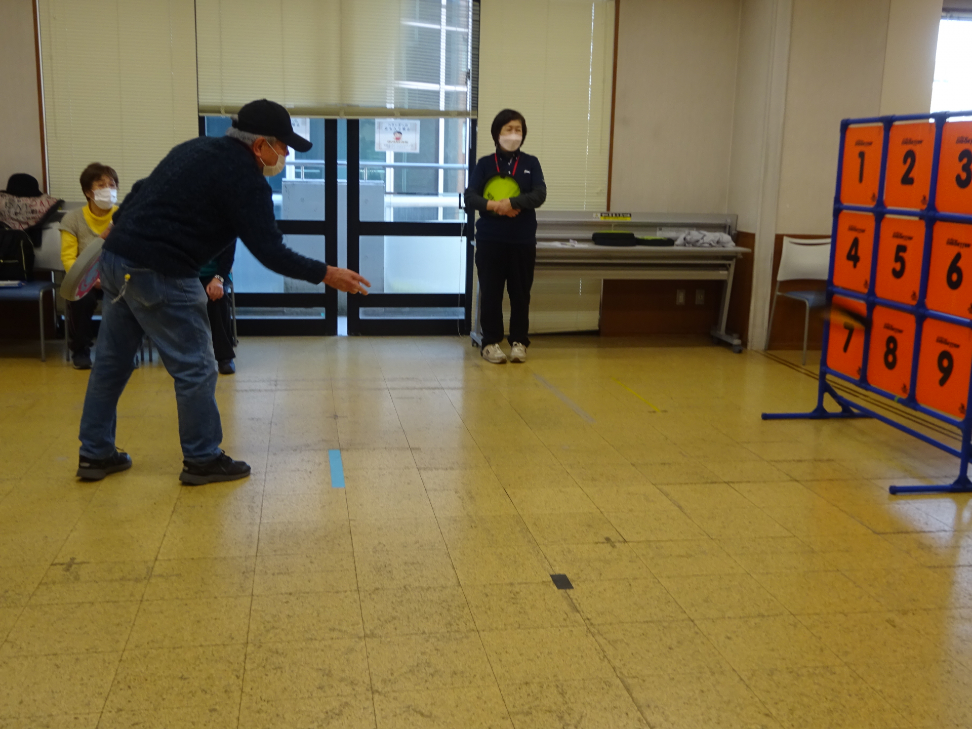 当たっても痛くないフリスビー型の「フライングディスク」を9枚の的をめがけて投げ点数を競うスポーツです。
