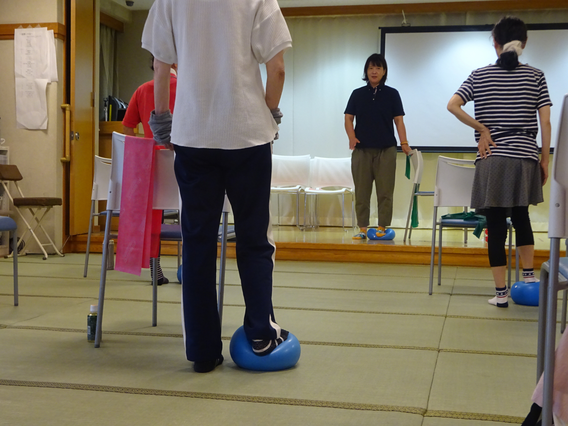 始めは座位でボールに慣れていただいた後に立位でボールを踏み、姿勢を保ちバランスをとりながら股関節から下を動かしていきました。