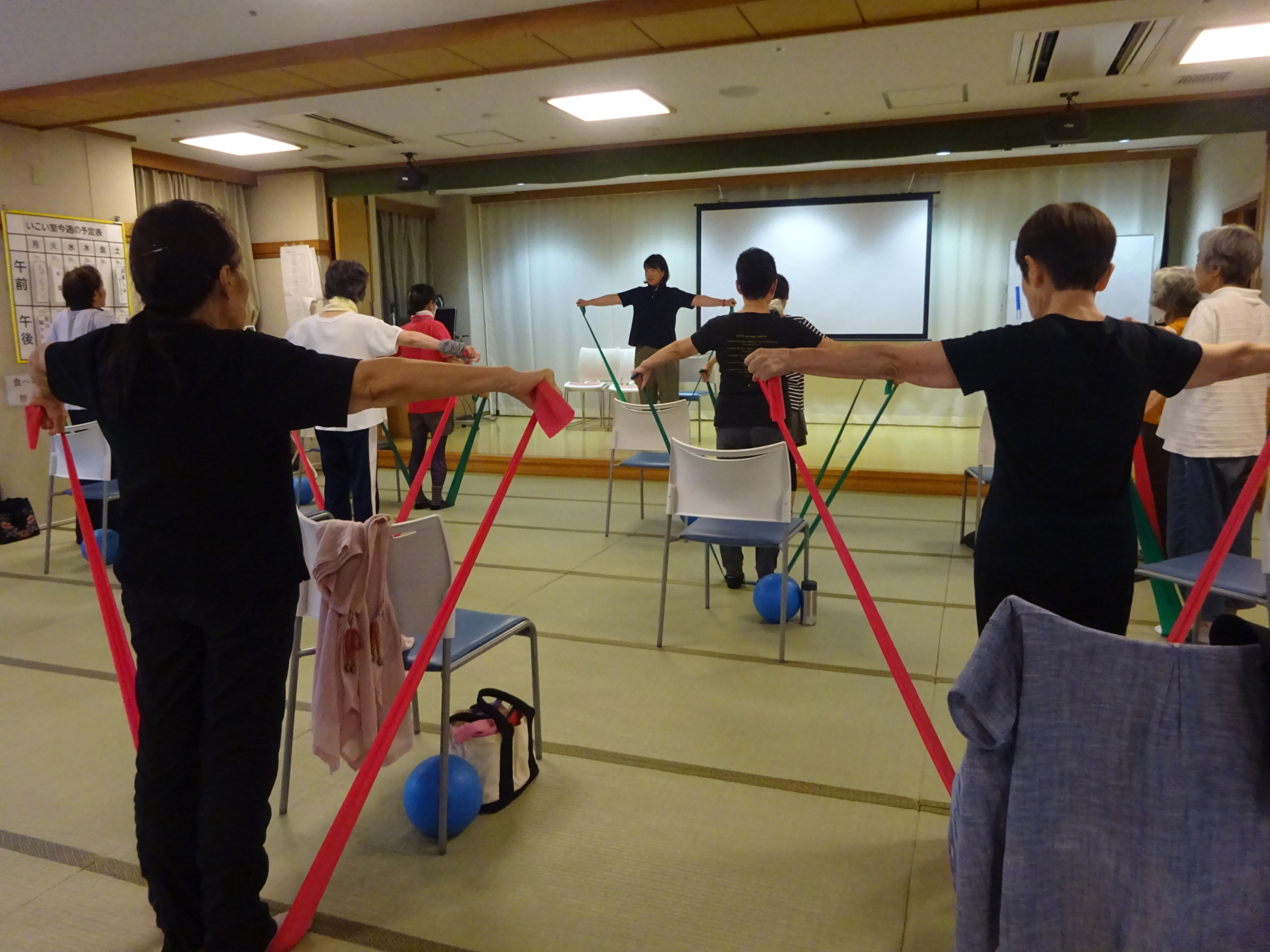 後半は、座位と立位でセラバンドも使い、最後は立位でバランスをとりながらの動作も行い、じわじわとゆっくり動かしていきます。