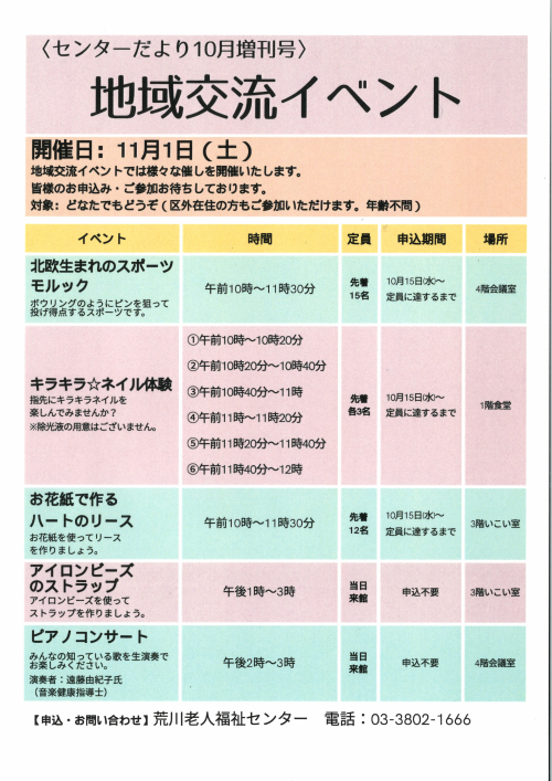 荒川老人福祉センターも、毎月ボランティア募集の記事を掲載しています。