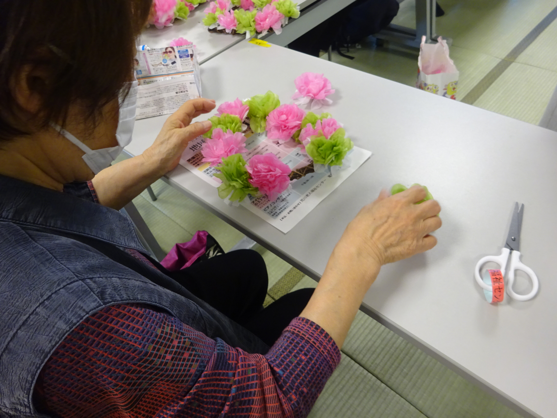 地域交流イベントで、お花紙を使ったハートのリースを作りました!