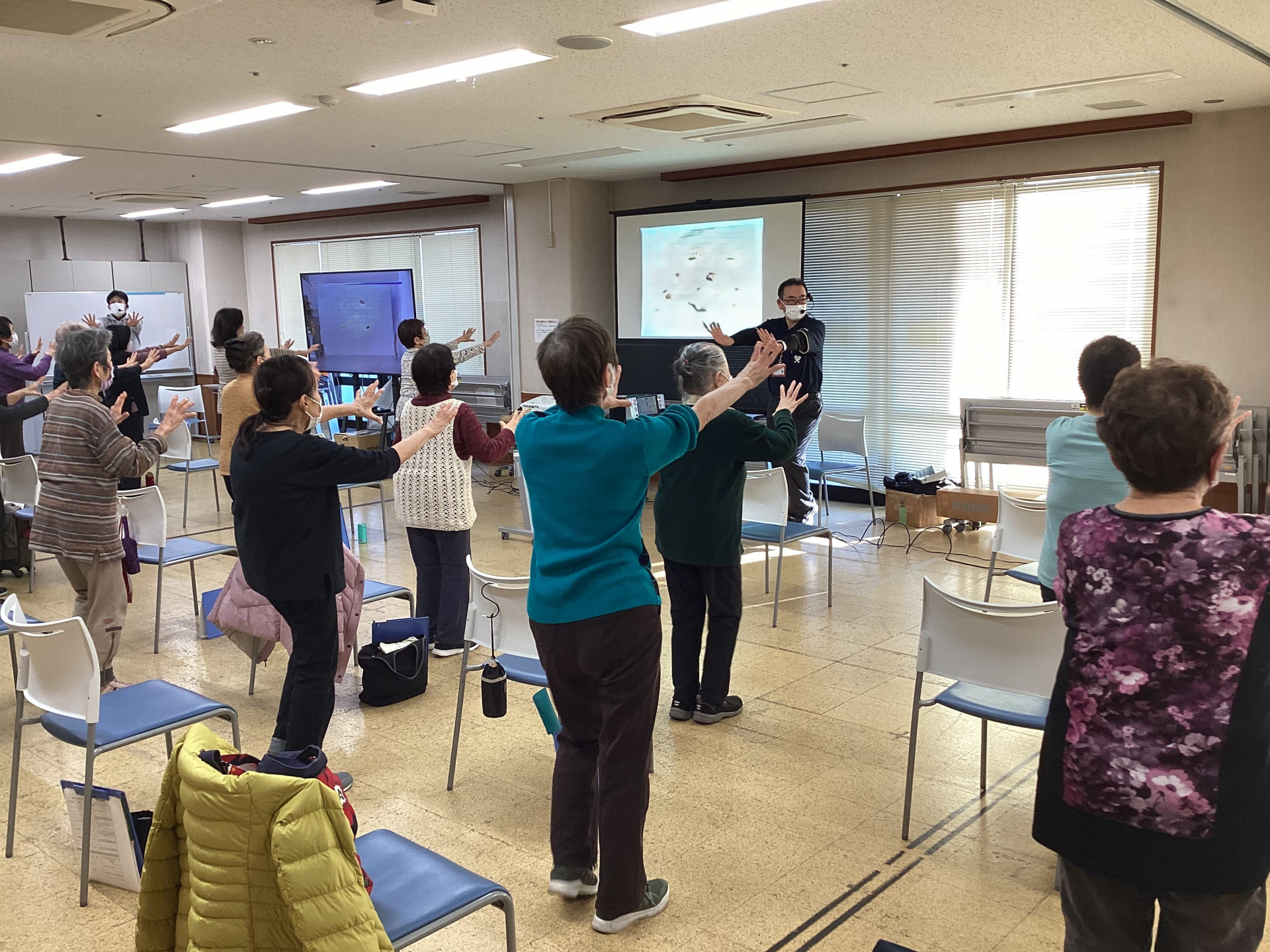 プロジェクターの映像を見ながら、音楽健康指導士の小林勝講師が司会進行役として、