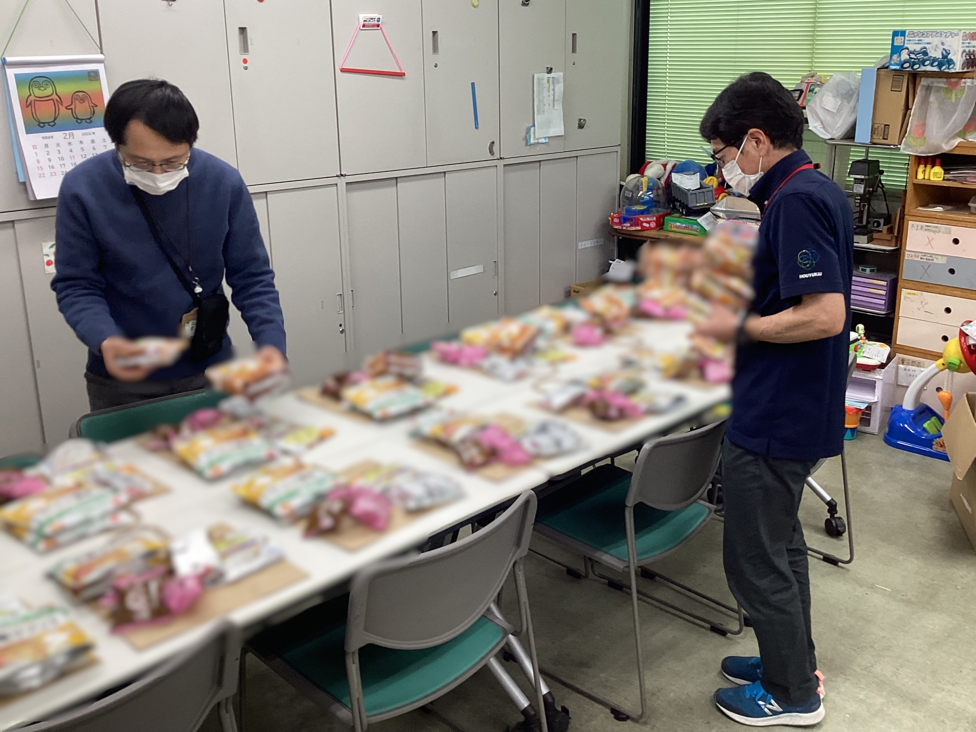 本日は、社協の職員の方、同法人の荒川地域包括支援センター職員と一緒に食品の仕分け・袋詰めの作業を行いました。