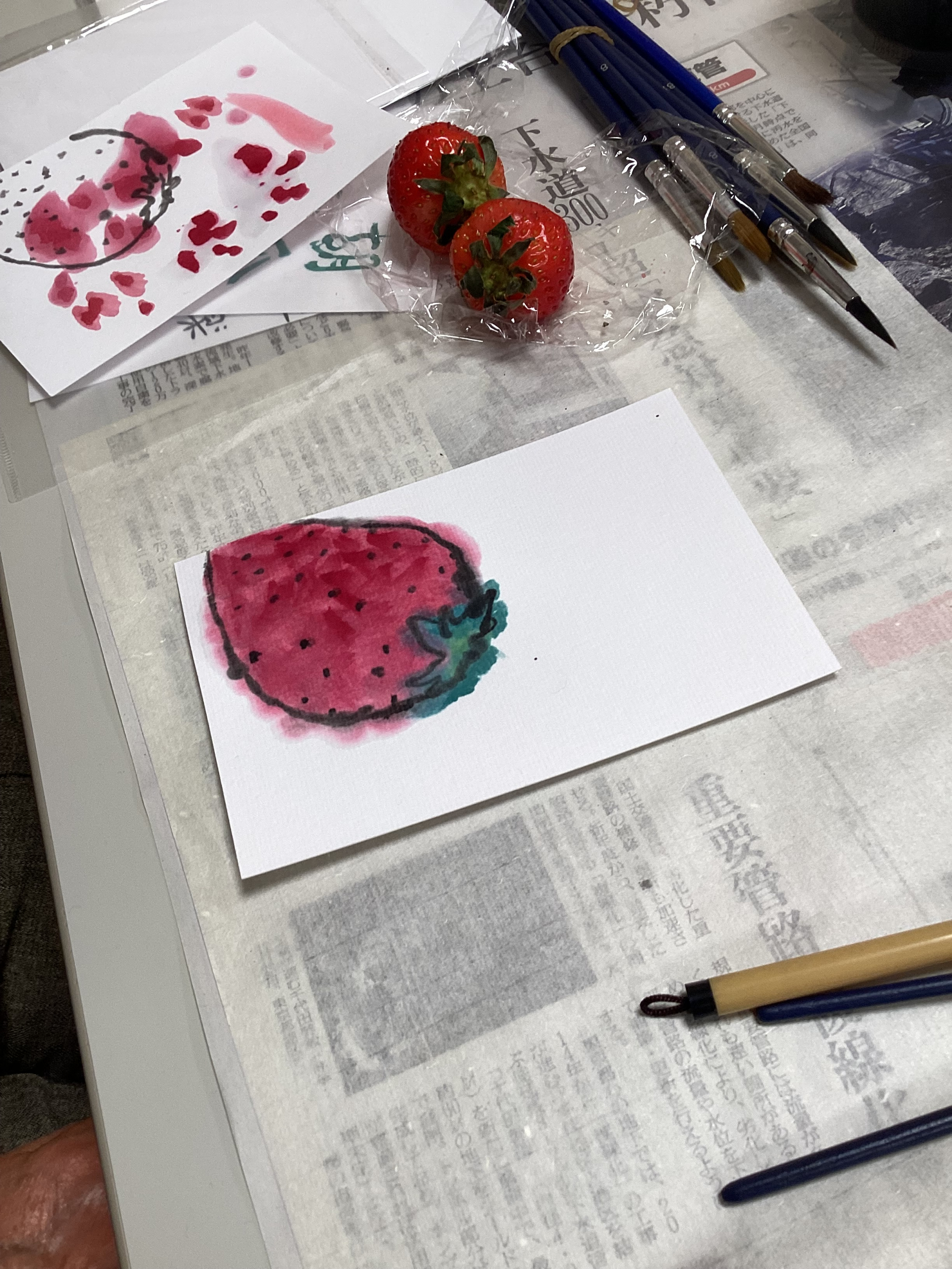 今まで描いた絵手紙を大事にファイルに綴じて持っていらっしゃる方、毎回旬のイチゴやモチーフを持ってきて描いて下さる方等々。皆様すっかり絵手紙の沼にはまり、新たな趣味を見つけられたようで嬉しいです♡