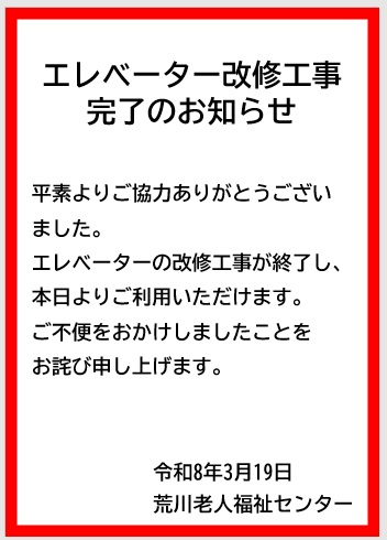 1月より始まりましたエレベーター改修工事が無事完了し、本日よりエレベーターの運行が開始いたしました。