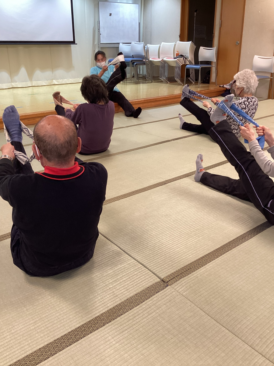 雨の中今期最後のいきいき体操です。手拭いを丸めてボールにして、お隣さんとキャッチボールしています、皆さん楽しそうに笑い声がひびいていました。