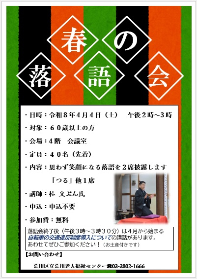 みなさまこんにちは。4月4日(土)は『春の落語会』を開催します。