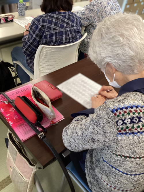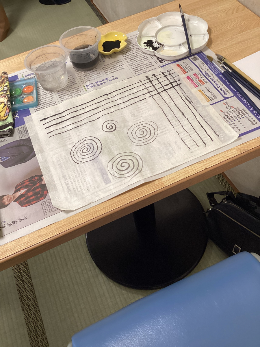 まずは先生から筆の持ち方を教わり、半紙に練習していきます。「緊張するわ~」と声がかかりますが、皆さんとっても楽しそうです。