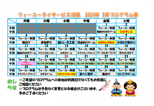 2024.10.26 今月のお掃除① 活動報告 #淡路デイ #掃除 #職員 2024.10.26 【淡路デイ】フラワーアレンジメント✿ 活動報告 #淡路デイ #デイサービス #レクリエーション #千代田区 #ボランティア #フラワーアレンジメント 2024.10.19 【淡路デイ】- ̗̀ ( ˶'ᵕ'˶) ̖́- お楽しみ講座の日! 活動報告 #淡路デイ #デイサービス #レクリエーション #イベント #千代田区 #ボランティア #介護予防 #脳トレ #体操 2024.10.14 【淡路デイ】φ(•ᴗ•๑) 筆ペン習字 活動報告 #淡路デイ #デイサービス #レクリエーション #千代田区 2024.10.12 【淡路デイ】"(*´○`)o Y先生の朗読会 活動報告 #淡路デイ #デイサービス #レクリエーション #イベント #千代田区 #ボランティア 2024.10.11 【淡路デイ】( 'ω' و( و 体操で心と体をリフレッシュ! 活動報告 #淡路デイ #デイサービス #千代田区 #体操 #介護予防 2024.10.08 【淡路デイ】今日の昼食は山形の郷土料理を楽しみました! お食事 #淡路デイ #デイサービス #千代田区 #お食事 #イベント食 2024.10.08 【淡路デイ】Y様、お帰りなさい! 活動報告 #淡路デイ #デイサービス #介護 #個別機能訓練 2024.10.07 【淡路デイ】新たに調理担当職員が入りました お食事 #淡路デイ #千代田区 #デイサービス #お食事 2024.10.05 【淡路デイ】筆ペン習字プログラム( ..)φ 活動報告 #淡路デイ #デイサービス #レクリエーション #千代田区 2024.10.01 【淡路デイ】10月になりました! 活動報告 #淡路デイ #デイサービス #千代田区 2024.09.30 【淡路デイ】10月プログラム表 お知らせ #淡路デイ #デイサービス #レクリエーション #イベント #千代田区 #体操 #ボランティア 2024.09.28 【淡路デイ】10月献立表 お食事 #淡路デイ #デイサービス #千代田区 #お食事 2024.09.28 エアコン 活動報告 #淡路デイ #掃除 2024.09.28 週末は…② 活動報告 #淡路デイ #掃除 1 … 15 16 17 18 19 … 29